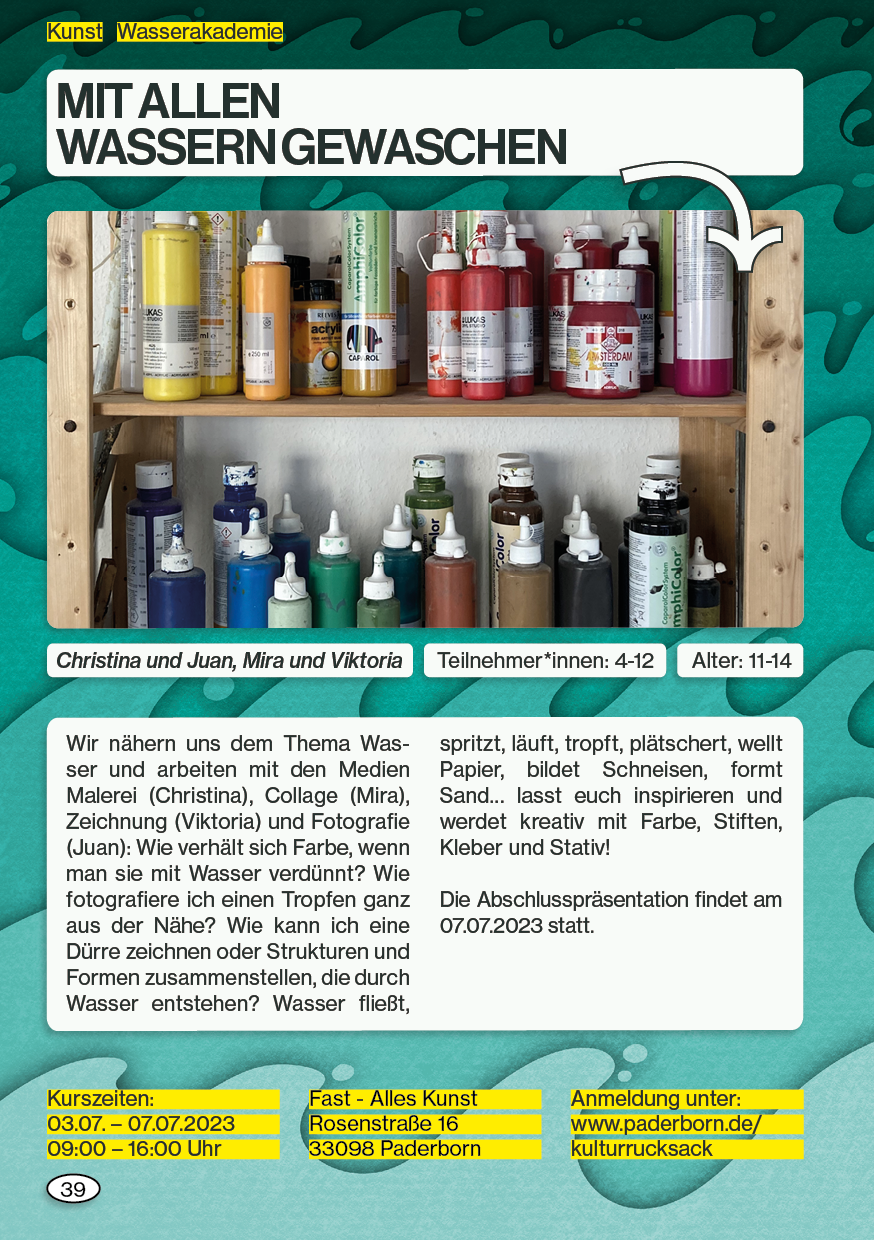 Sie befinden sich hier:StartseiteBildung UniversitätKulturelle BildungDie WasserakademieMit allen Wassern gewaschen! für 10- bis 14-Jährige Mit allen Wassern gewaschen für 10- bis 14-Jährige Mit Farben, Stiften, Kleber und Stativ kreativ werden! © Christina Strunz
