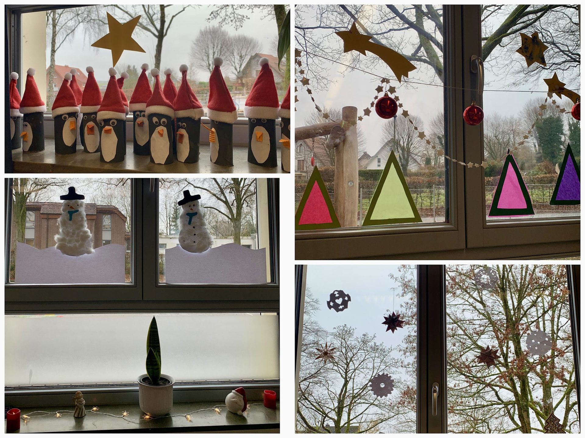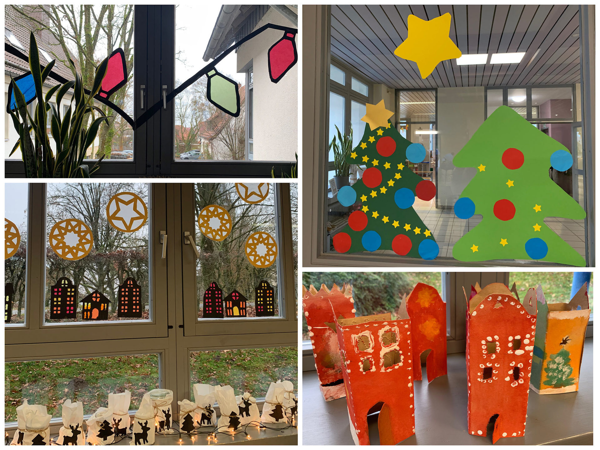 Es entstanden kleine Pinguine und Schneemänner aus Watte, die vor selbst gestalteten Winterlandschaften stehen und sofort für eine winterliche Stimmung sorgen. Überall leuchten farbige Tannenbäume, selbstgebastelte Lichterketten und bunte Transparentpapierbilder. Sterne und Schneeflocken schmücken die Fenster und bringen warmes Licht in die Klassenräume. Leuchtende Häuschen und kleine Stadtlandschaften wirken wie Adventsdörfer in den Fenstern.