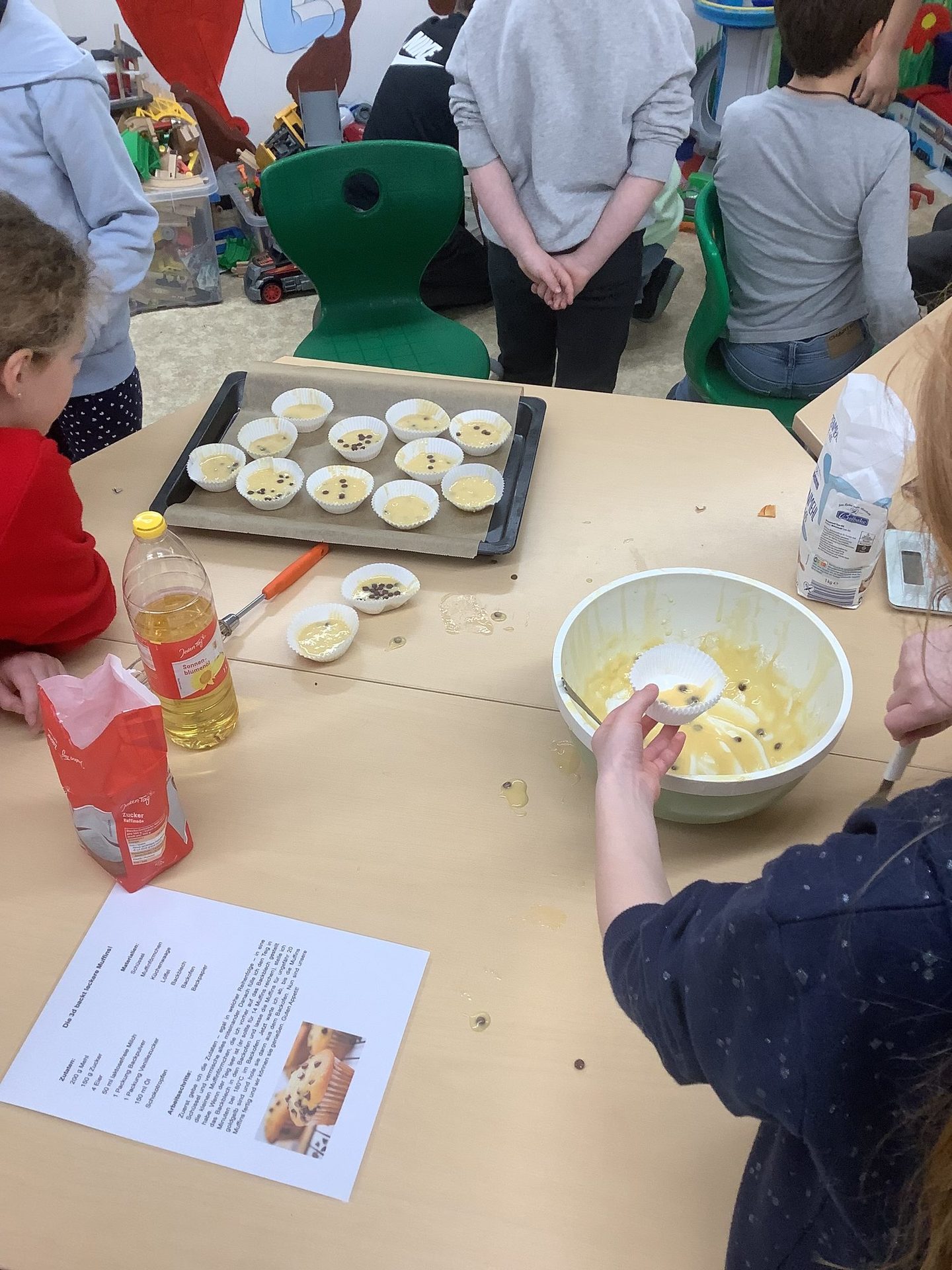 Zum Abschluss dieser Unterrichtseinheit wurde das Gelernte in die Praxis umgesetzt. Gemeinsam backte die Klasse leckere Muffins. Mit viel Freude, Teamarbeit und großer Begeisterung wurden Zutaten abgewogen, Teig gerührt und Förmchen gefüllt. Dabei zeigte sich, dass Lesen und Verstehen von Texten nicht nur im Heft, sondern auch in der Küche wichtig ist.