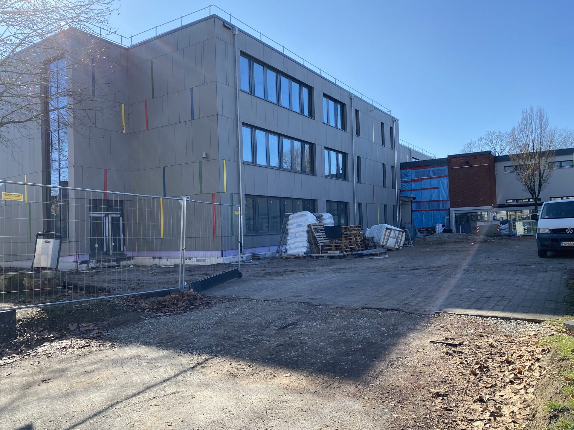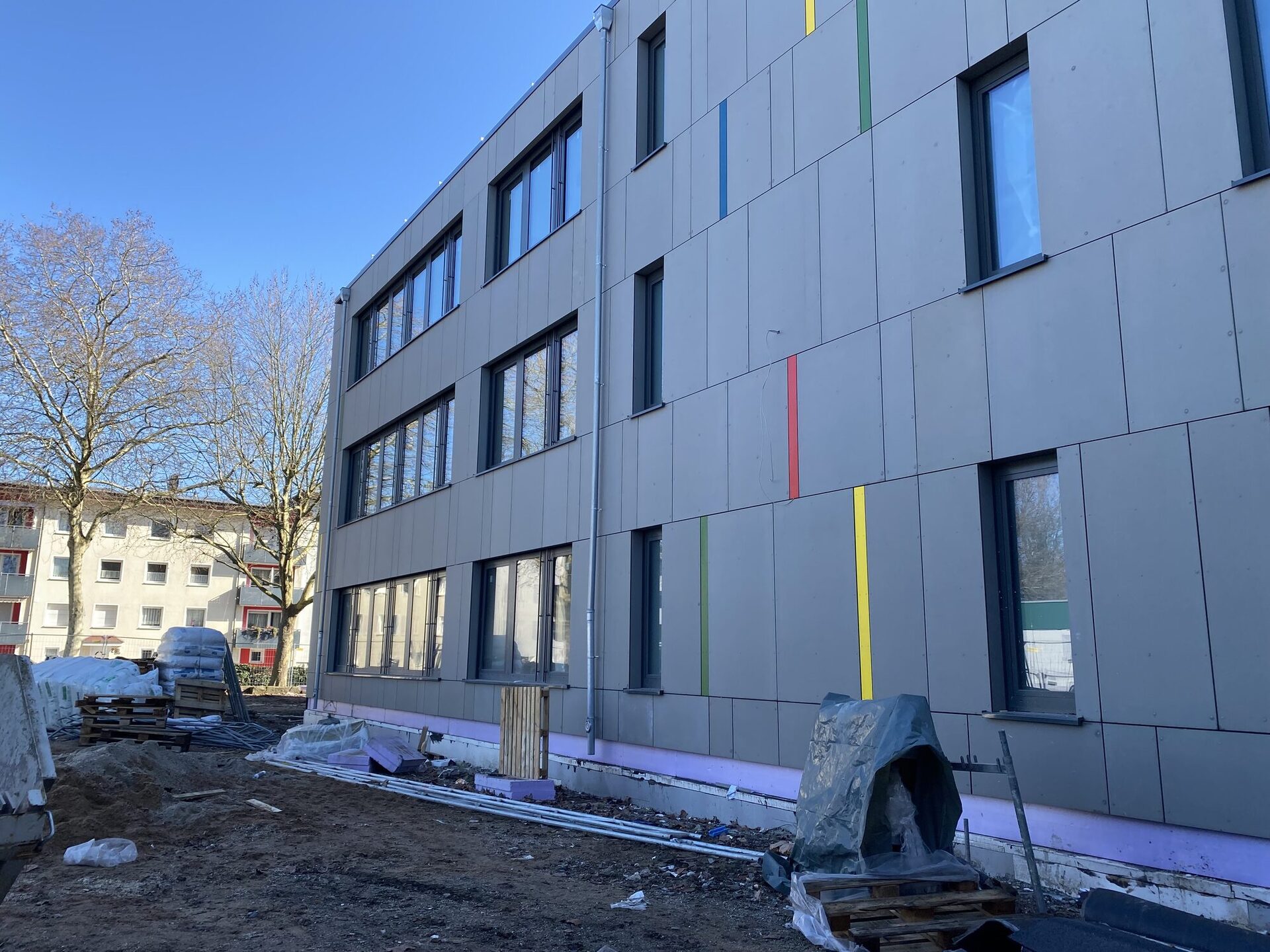 Damit zeigt sich das Gebäude nun erstmals in seiner endgültigen Gestaltung. Die moderne Fassadenverkleidung, die großen Fensterflächen und die farbigen Akzente des Schullogos prägen das Erscheinungsbild und verleihen dem Neubau eine freundliche und zeitgemäße Wirkung.