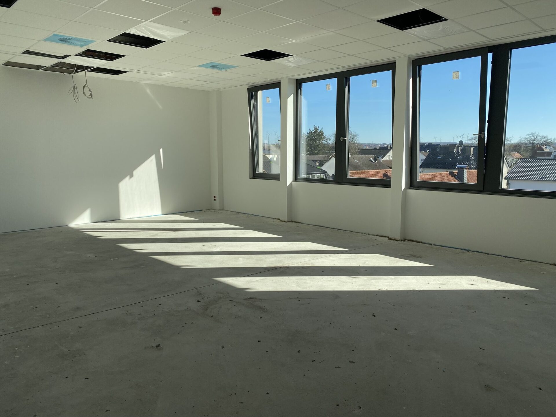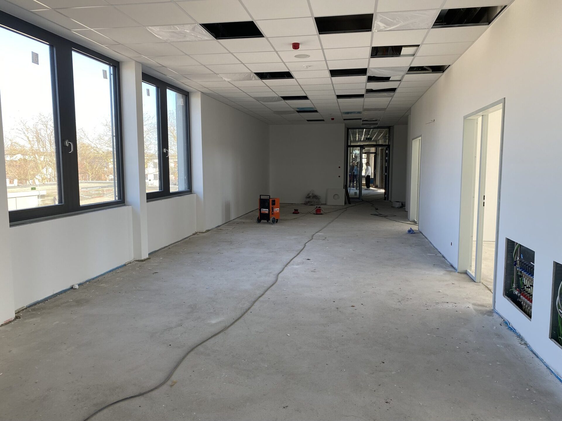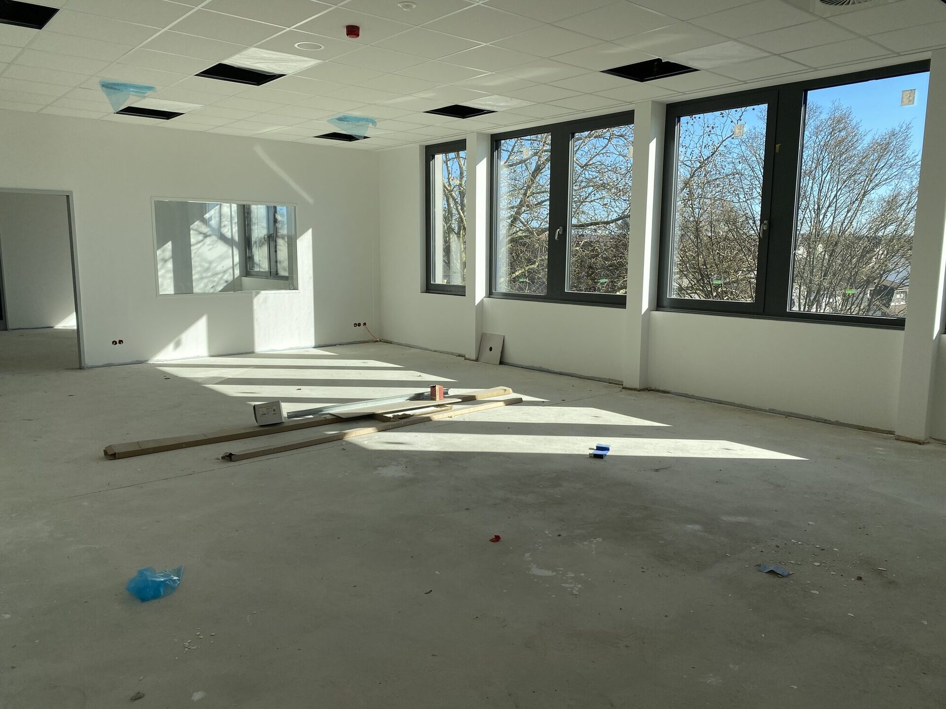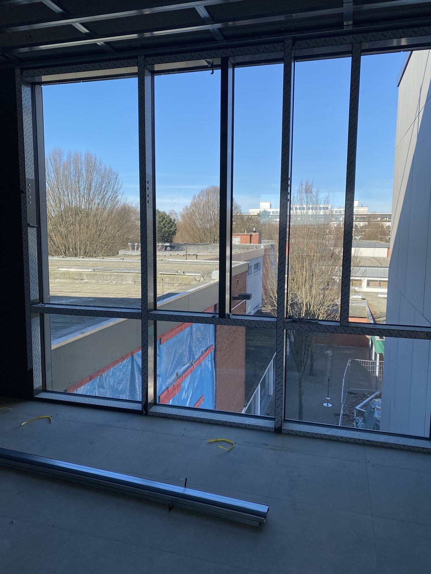 Der Innenausbau unseres neuen Schulgebäudes macht große Fortschritte. In vielen Bereichen sind die Wände bereits fertiggestellt und die großen Fenster sorgen für helle, freundliche Räume. Auch die Decken werden derzeit weiter ausgebaut, sodass Beleuchtung, Lüftung und Technik installiert werden können.