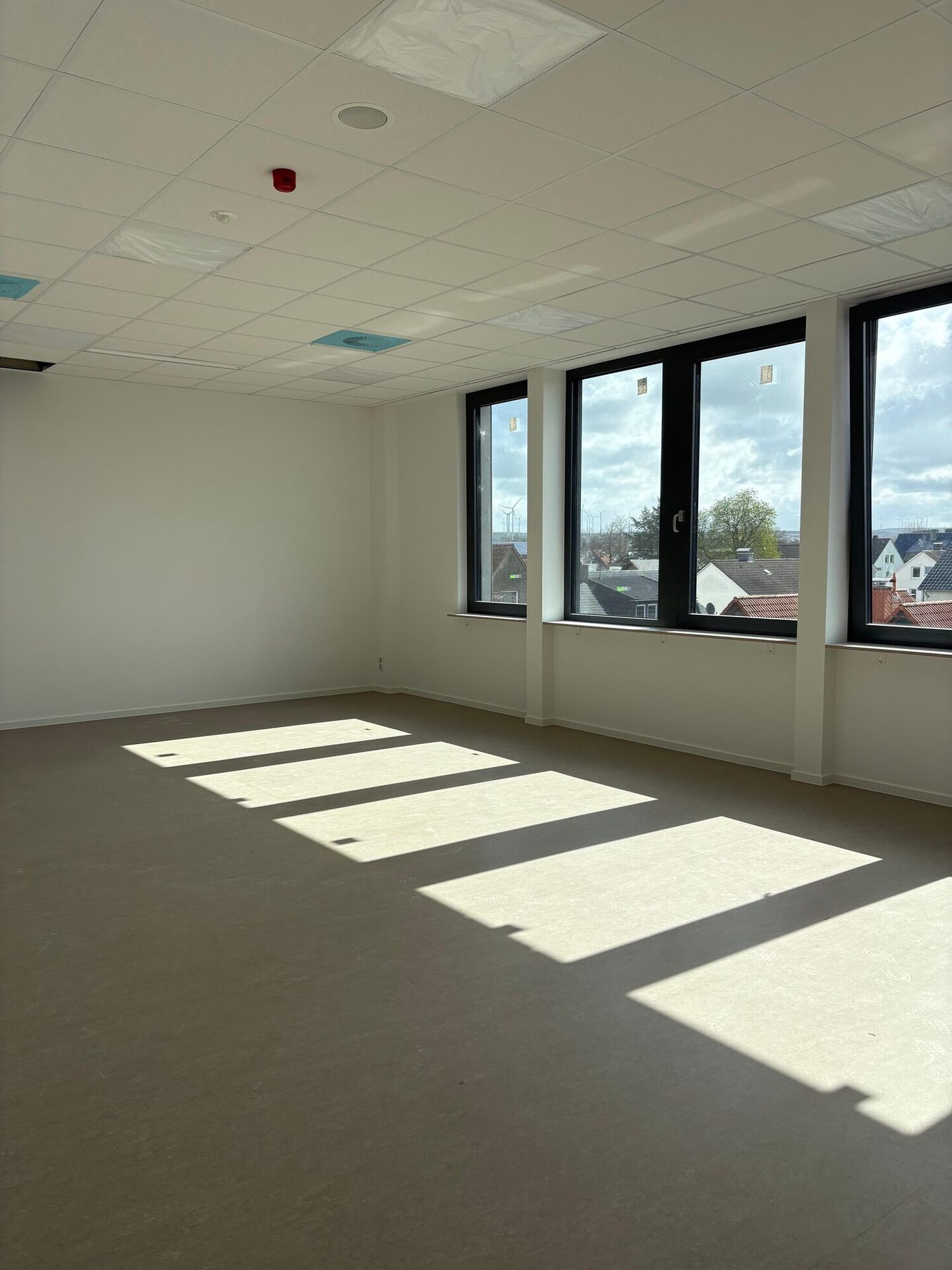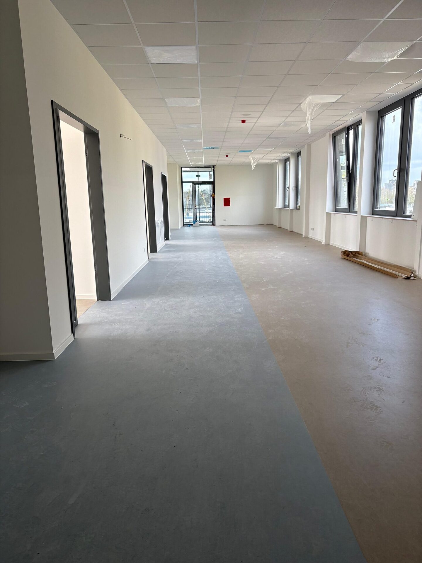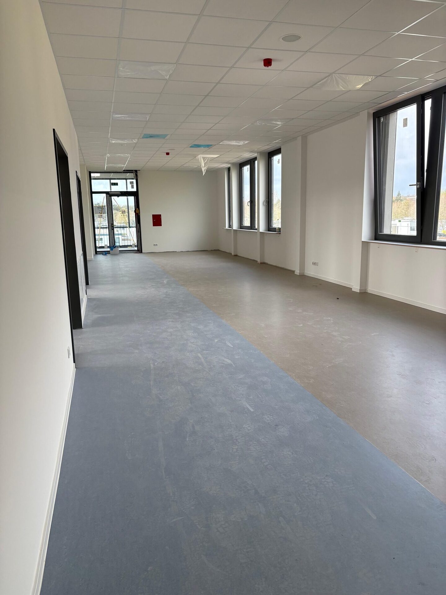 Die großzügigen, lichtdurchfluteten Flure mit ihren großen Fensterfronten sorgen zusätzlich für eine angenehme Lernumgebung. Tageslicht fällt tief in die Räume und schafft eine offene, freundliche Stimmung. Gleichzeitig sind die Bauarbeiten noch im Gange: Deckenarbeiten, Installationen und letzte Anpassungen werden aktuell durchgeführt.