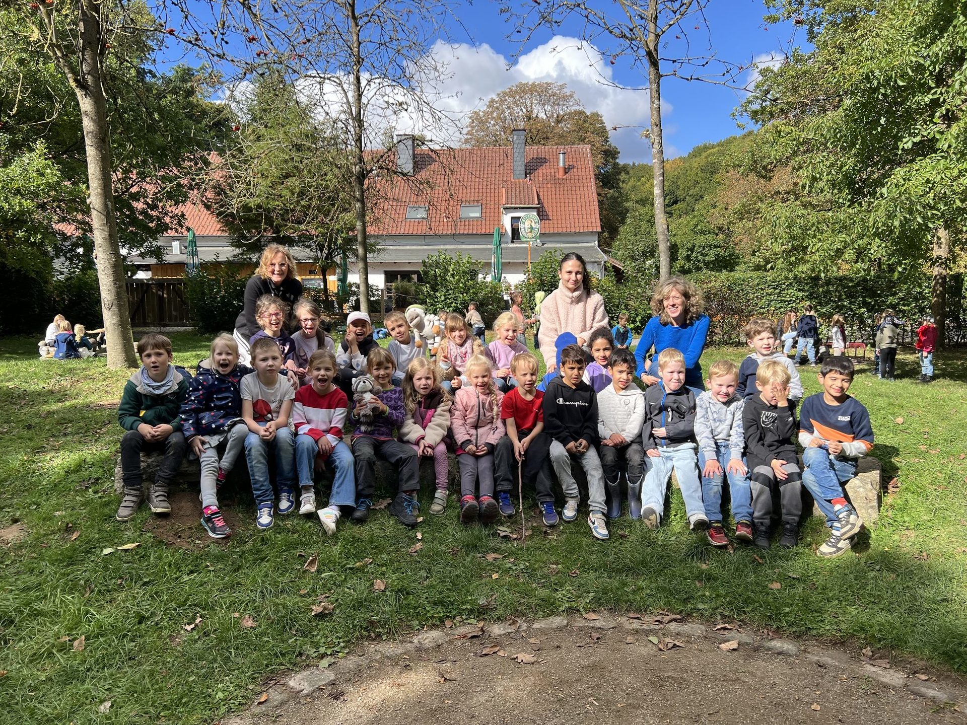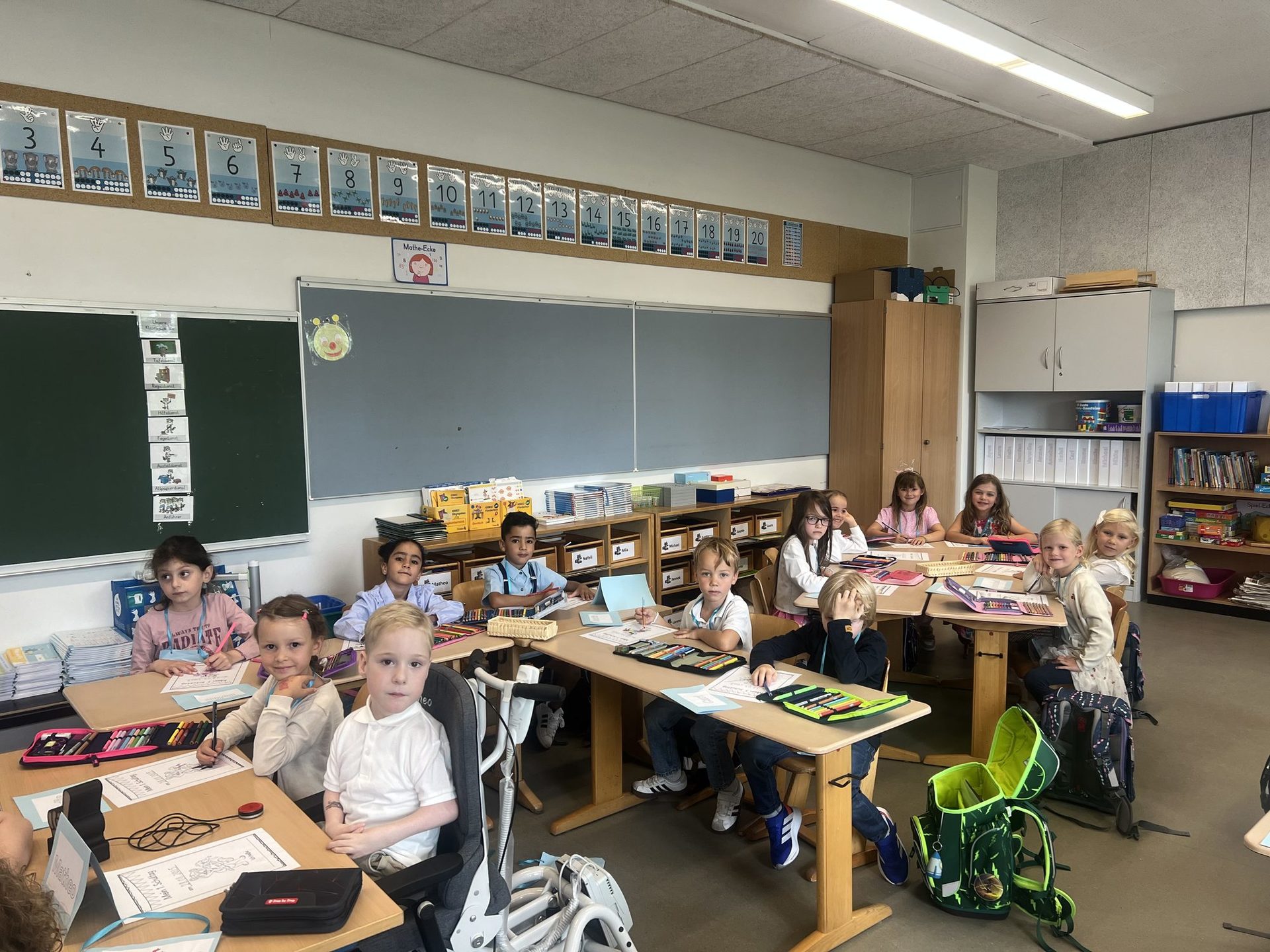 Wir freuen uns, endlich Schulkinder zu sein und lernen in unserer Klasse zusammen mit unseren Lehrerinnen Frau Voth-Meli und Frau Heinemann und unserem Klassentier Willi Waschbär.