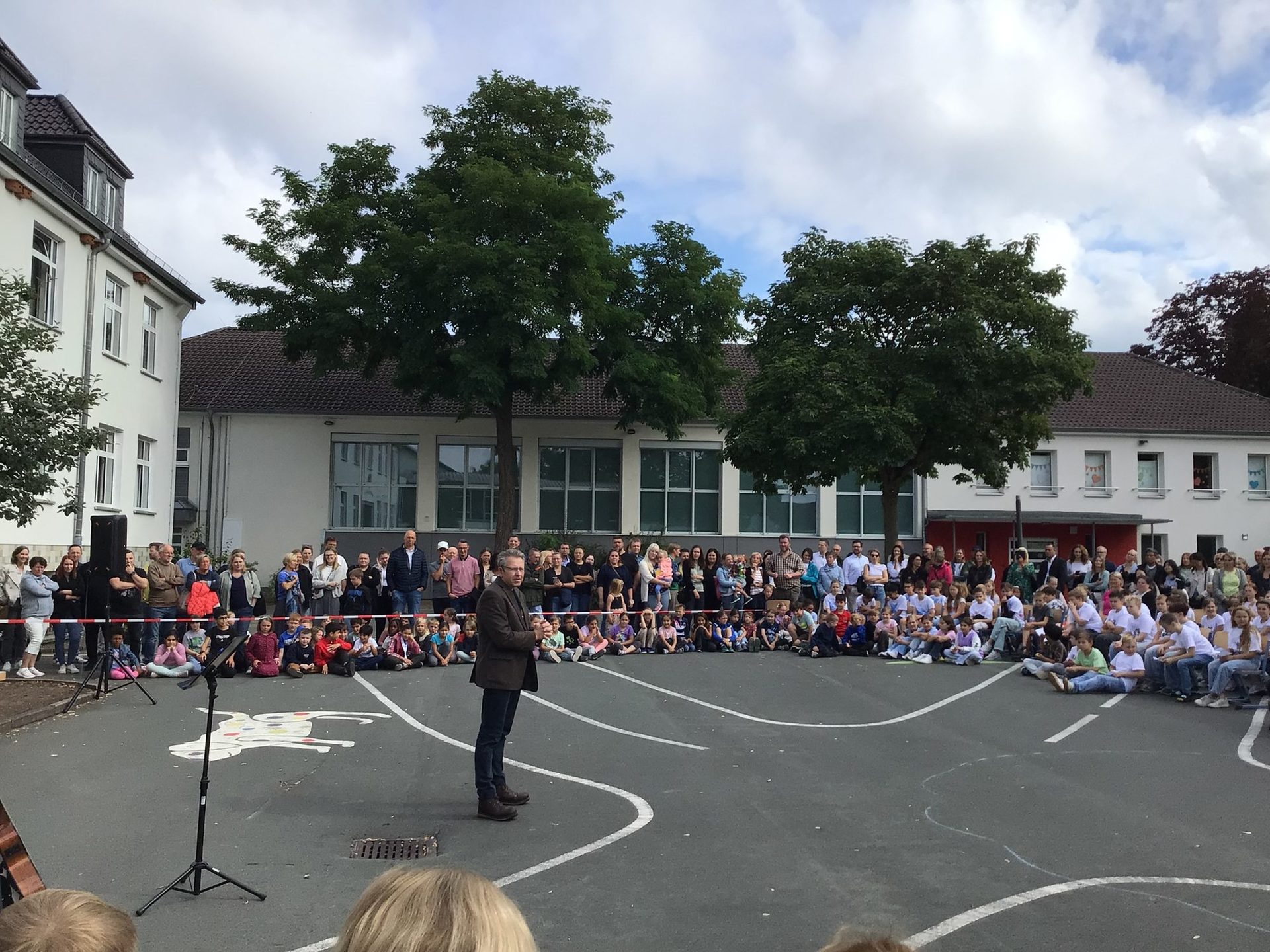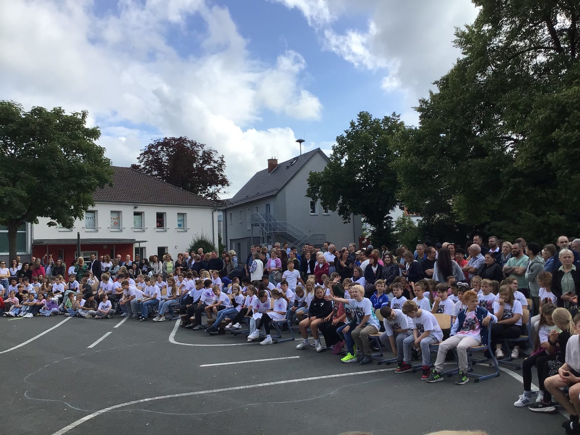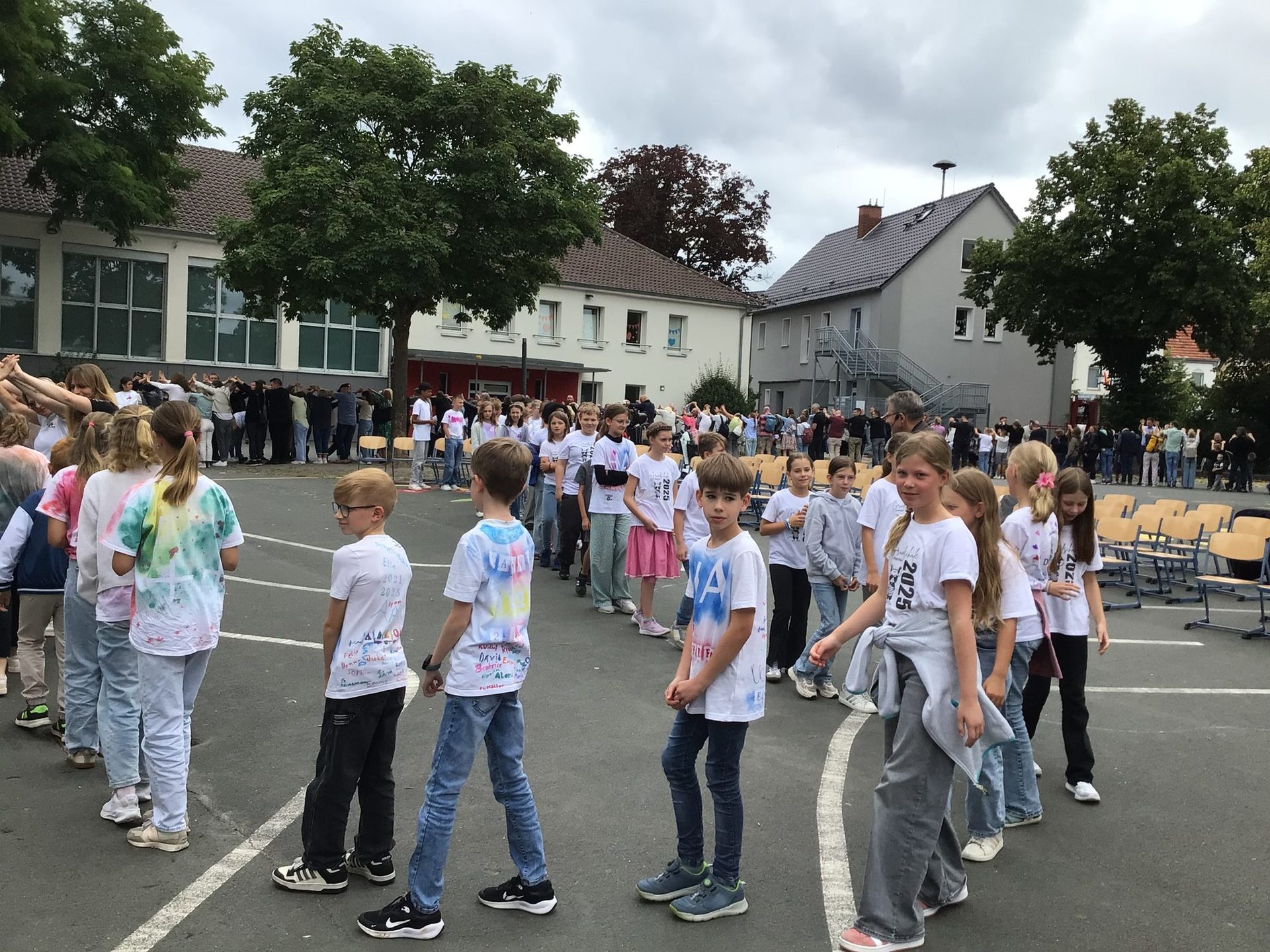 Nach der großen Pause versammelten sich alle Kinder der Dionysiusschule auf dem Schulhof. Viele Eltern und Verwandte kamen hinzu und so konnten wir uns alle zusammen von unseren Viertklässlern verabschieden.