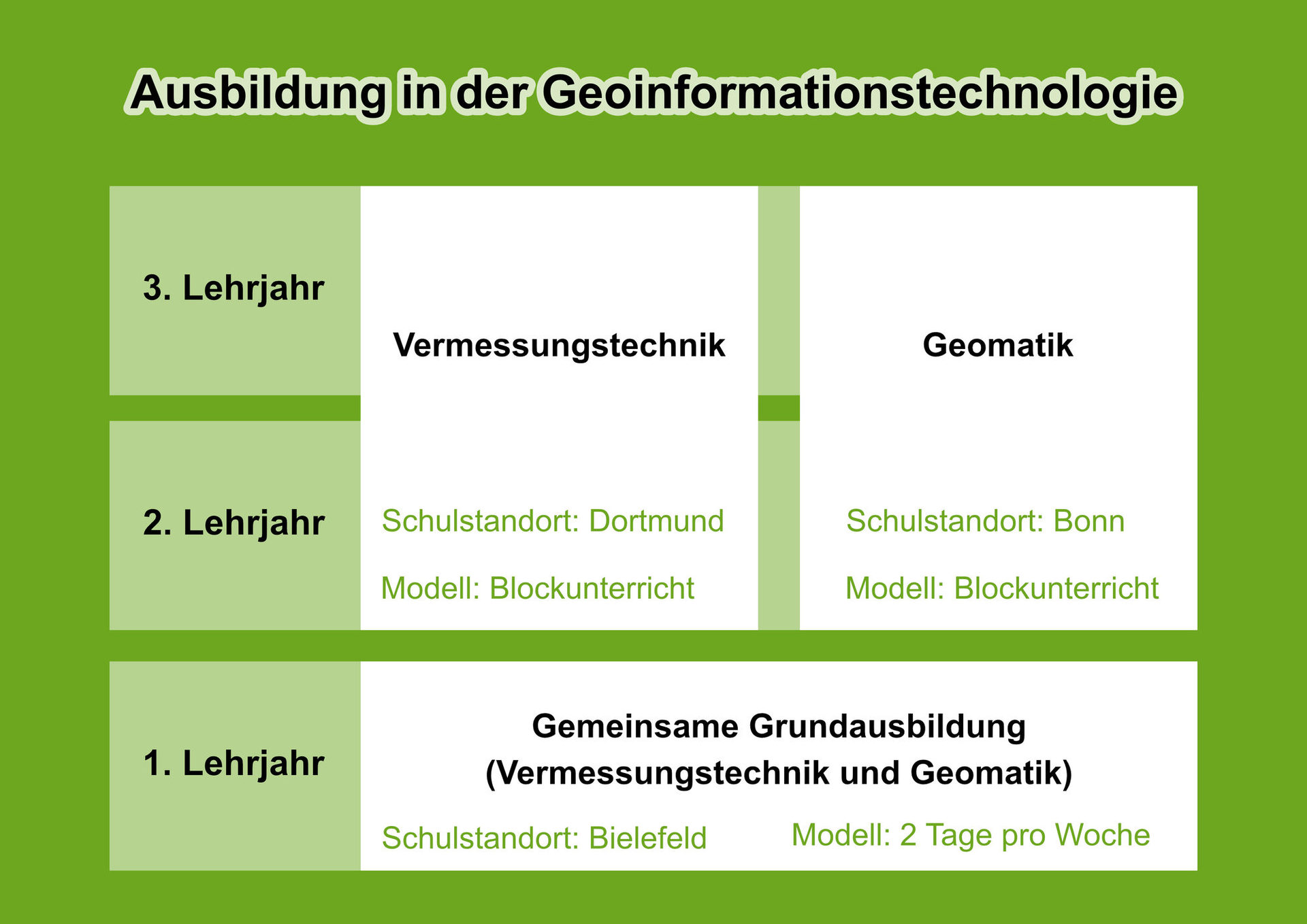 Im zweiten und dritten Ausbildungsjahr werden die Geomatiker*innen in einer Landesfachklasse am Heinrich-Hertz-Europakolleg in Bonn unterrichtet. Der Unterricht findet in mehreren, etwa vier Wochen langen, Schulblöcken statt. Dabei werden die Inhalte aus dem ersten Jahr vertieft sowie neue Themenbereiche der Geoinformationstechnologie erarbeitet.