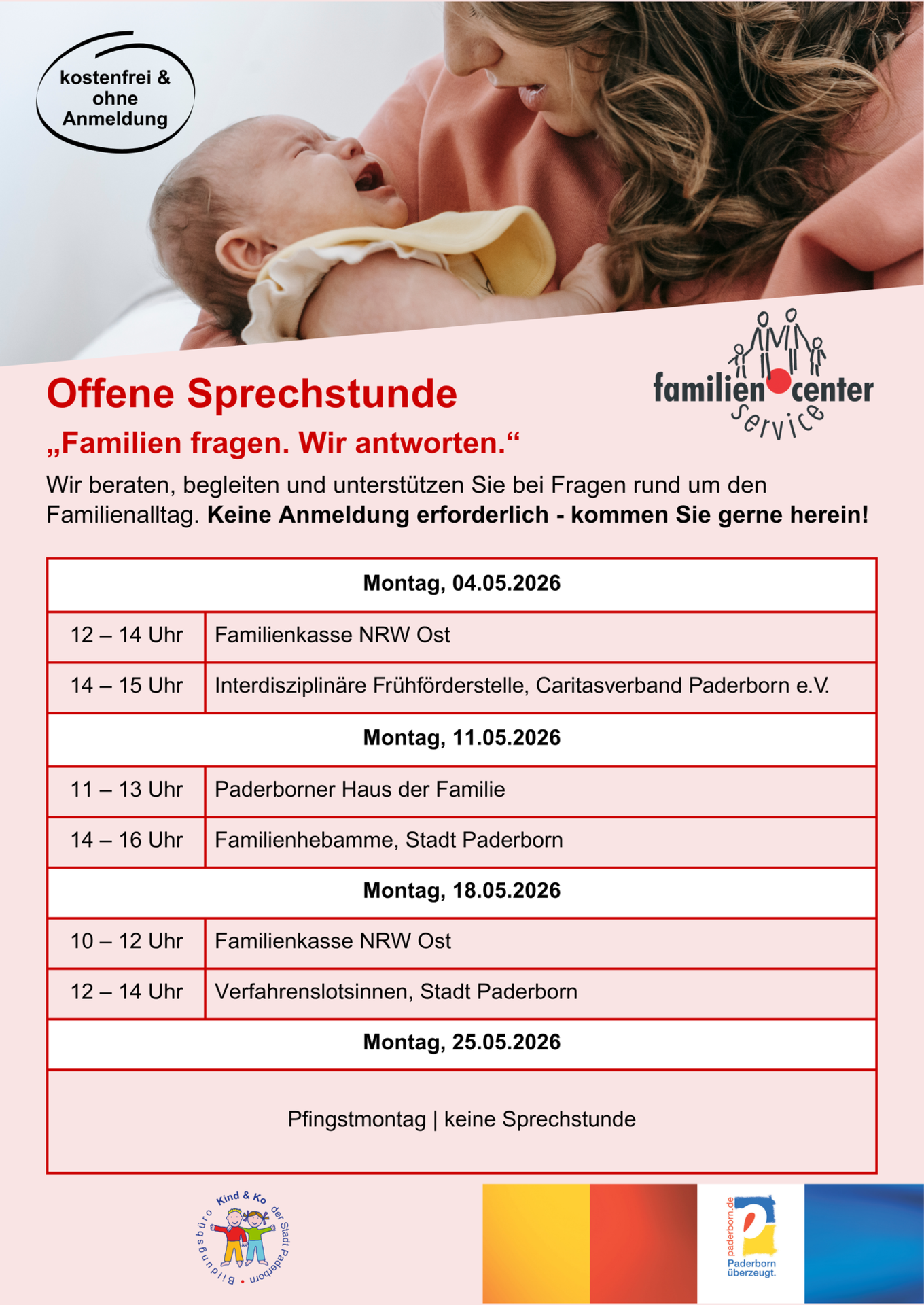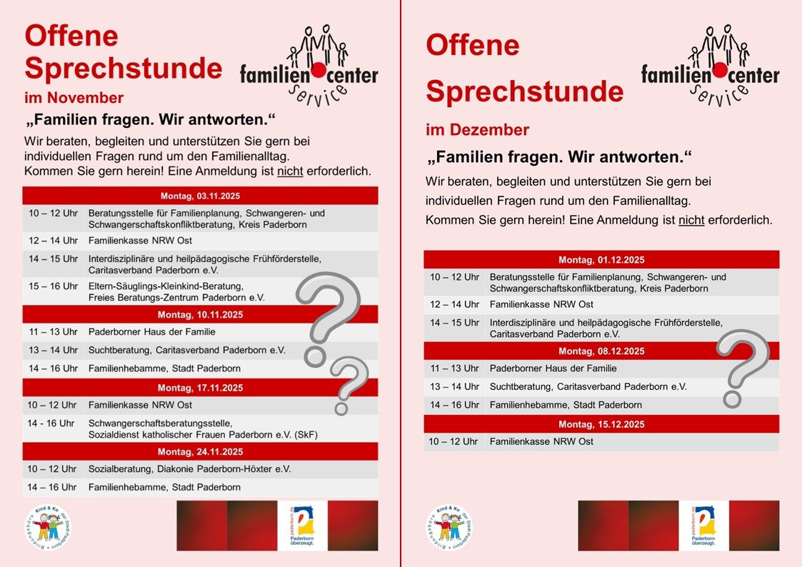 Sie haben Fragen rund um den Familienalltag? In Zusammenarbeit mit dem FamilienServiceCenter informieren und beraten Sie verschiedene Institutionen gerne jeden Montag zwischen 10 und 16 Uhr im Rathaus der Stadt Paderborn.
