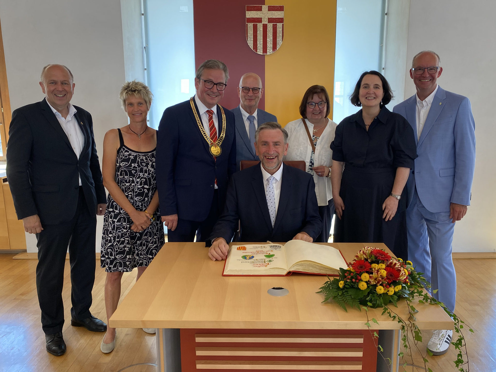 Günther Felßner, Festredner beim Tag des Landvolks am Dienstag der Libori-Woche, hat sich auf Einladung von Bürgermeister Michael Dreier in das Goldene Buch der Stadt Paderborn eingetragen. Felßner ist seit Oktober 2022 Präsident des Bayerischen Bauernverbandes, in dem er sich seit mehr als 20 Jahren für die Landwirtschaft engagiert.
