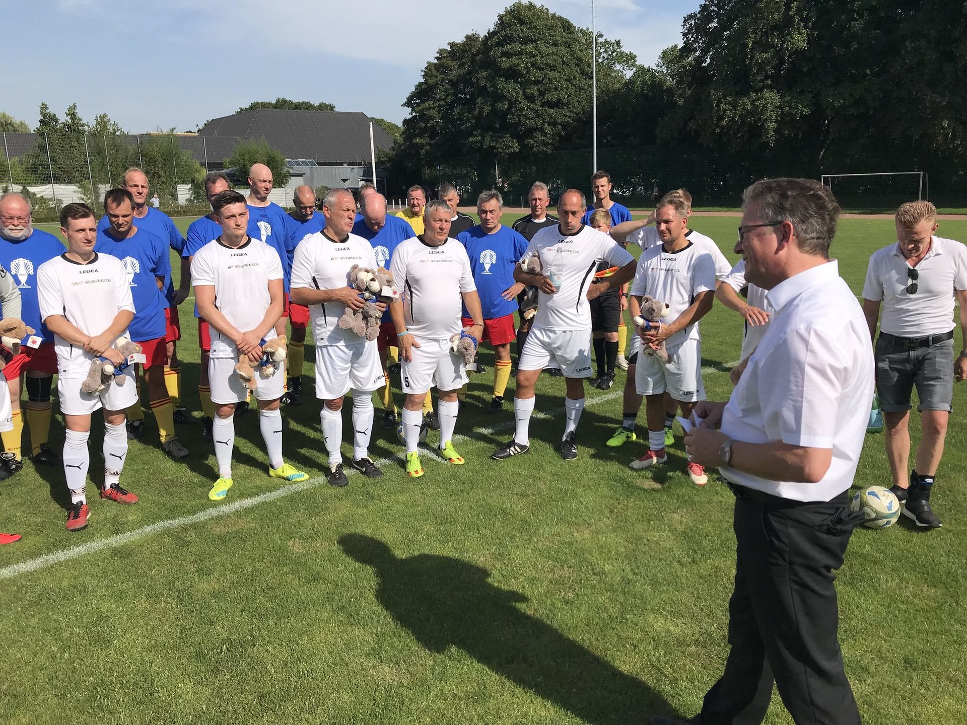 Das gab es auch noch nie: Steffen Baumgart, der Cheftrainer der Bundesligafußballer des SC Paderborn 07 als Späher beim traditionellen Fußballspiel zwischen der verstärkten Auswahl des Rates gegen die Schausteller. Und er sah eine deftige Pleite der Ratsauswahl. Mit 1:7 gingen die Mannen um Chefcoach Wolfgang Fingerhut unter. Nach 2:7 im Vorjahr lief es bei tropischen Temperaturen auf der Paderkampfbahn anfangs für die Elf aus dem Rathaus ganz gut. Sie hielten den Ball vom eigenen Tor fern und starteten immer wieder Angriffe und hatten auch ihre Chancen. Doch mit zunehmender Spielzeit wurde es dann doch einseitig. Dem 1:0 vom starken Mandelbudenbetreiber Ronny Marx ließ der Ringewerferbudenbetreiber Lutz Steiger schnell das 2:0 folgen. Florian Lessmann, die Verstärkung vom SV Heide, ließ die Ratsauswahl mit seinem sehenswerten Treffer kurz hoffen. Und obwohl Senior Rudi Marx mit dem 3:1 für die Schausteller den zwei Toreabstand wieder herstellte, hatte Feuerwehrmann Thomas Ilskens mit seinem Lattenknaller wieder die Chance zu verkürzen. Doch es sollte anders kommen. Rudi Marx, Senior, lief zu Höchstform auf und besorgte das vierte und fünfte Tor für die Schausteller, bevor dann Alex Karow von der "Grünen Küche" und wieder Ronny Marx für die Tore Nr. 6 und 7 für die Schausteller sorgten.