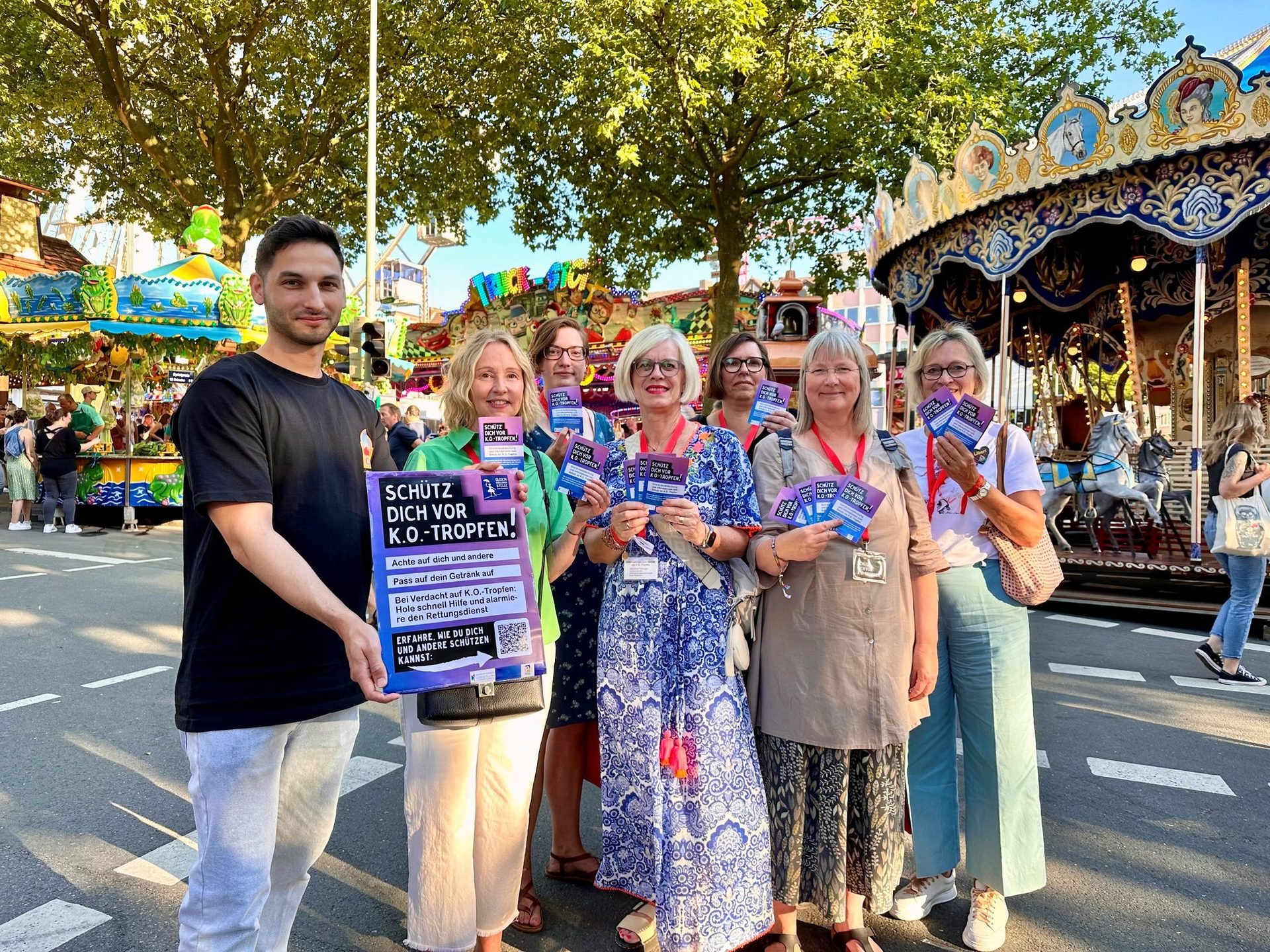 Das Team der städtischen Gleichstellungsstelle und des Gleichstellungsbüros der Universität Paderborn hat am Montag, 29. Juli, auf dem Liboriberg Info-Flyer samt Getränkeabdeckung an Liboribesucher*innen verteilt und Aufklärungsarbeit zum Thema K.O.-Tropfen geleistet. Dabei ging es um Fragen wie: Was sind eigentlich K.O.-Tropfen? Wie wirken sie? Und: Wie kann ich mich gegen sie schützen?