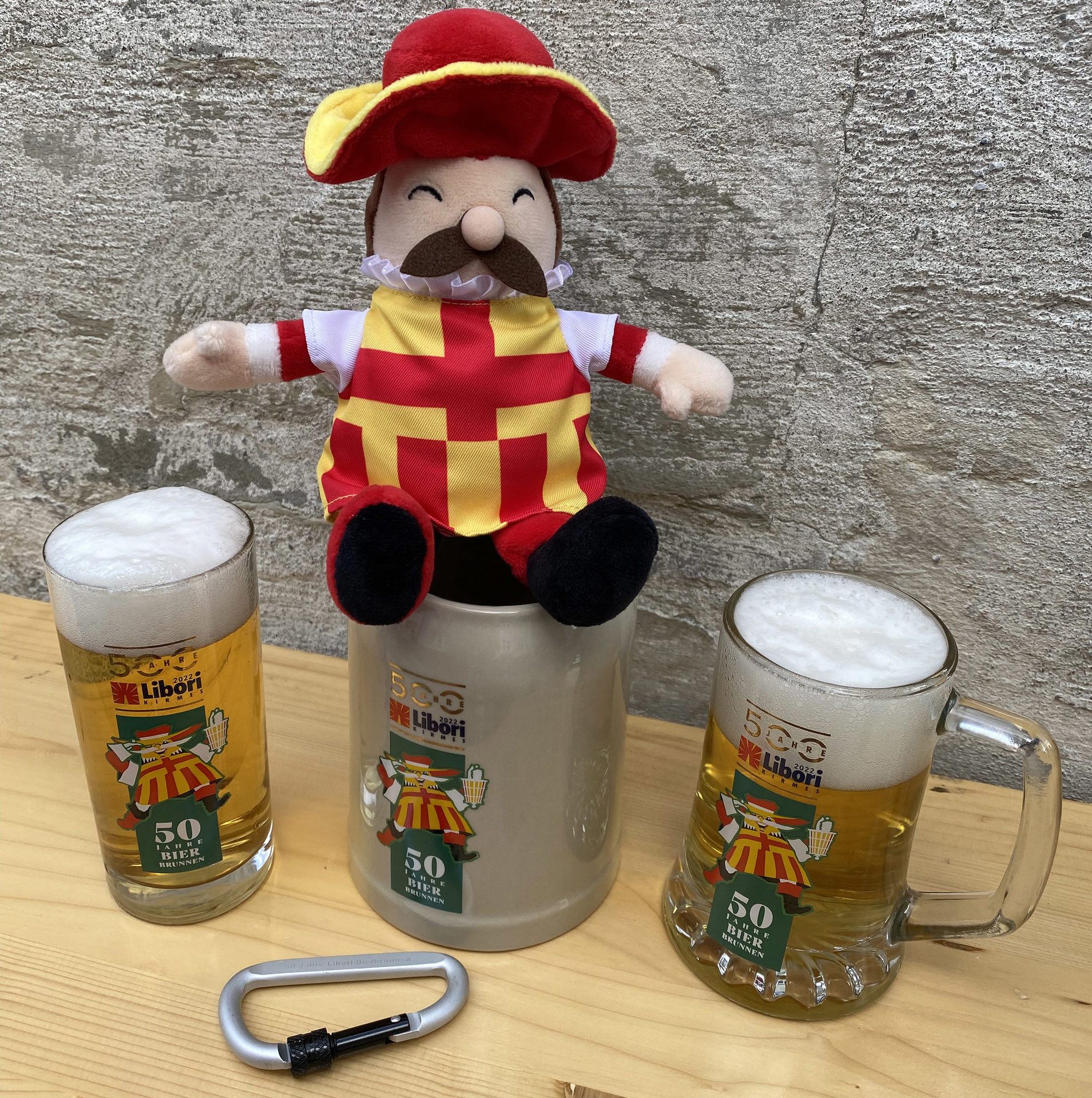 Das Motiv der begehrten Krüge und Gläser ist dem 50. Jubiläum des Bierbrunnens gewidmet und greift das allererste Bierbrunnenmotiv aus dem Jahr 1971 auf: einen Jubelhennes. Passend zum Jubiläum gibt es weitere Merchandising-Artikel wie den Plüsch-Jubelhennes (6 Euro) oder den Karabinerhaken (2 Euro) zur praktischen Befestigung des Kruges an der Gürtelschnalle.