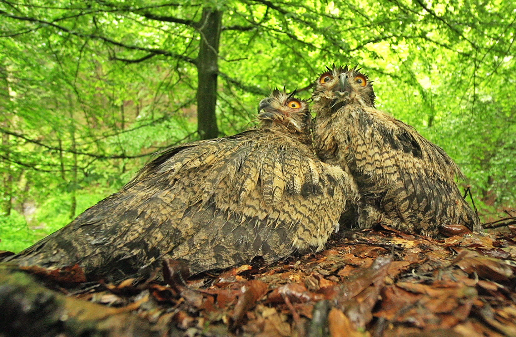 © Robin JähneVom Wetter zerzaust: Den jungen Uhus ist förmlich die Entrüstung über das Unwetter anzusehen.