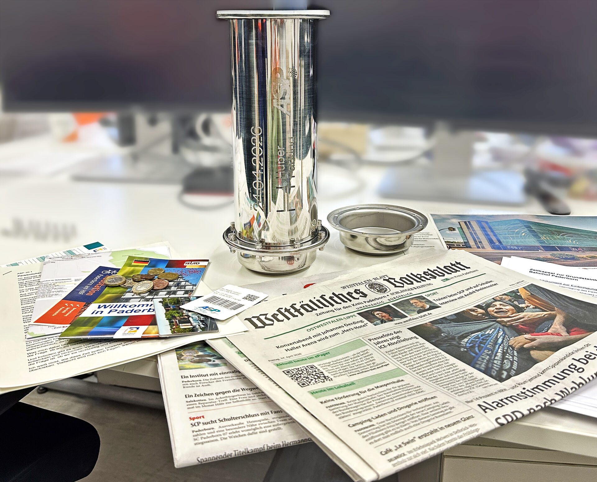Paderborn, 24. April 2026 – Mit der heutigen Grundsteinlegung ist ein weiterer zentraler Meilenstein für das Projekt „Parkhaus am Bahnhof“ erfolgreich umgesetzt worden. Am Morgen wurde auf dem Baufeld symbolisch eine Zeitkapsel vergraben und damit der Start der Hochbauphase offiziell markiert.