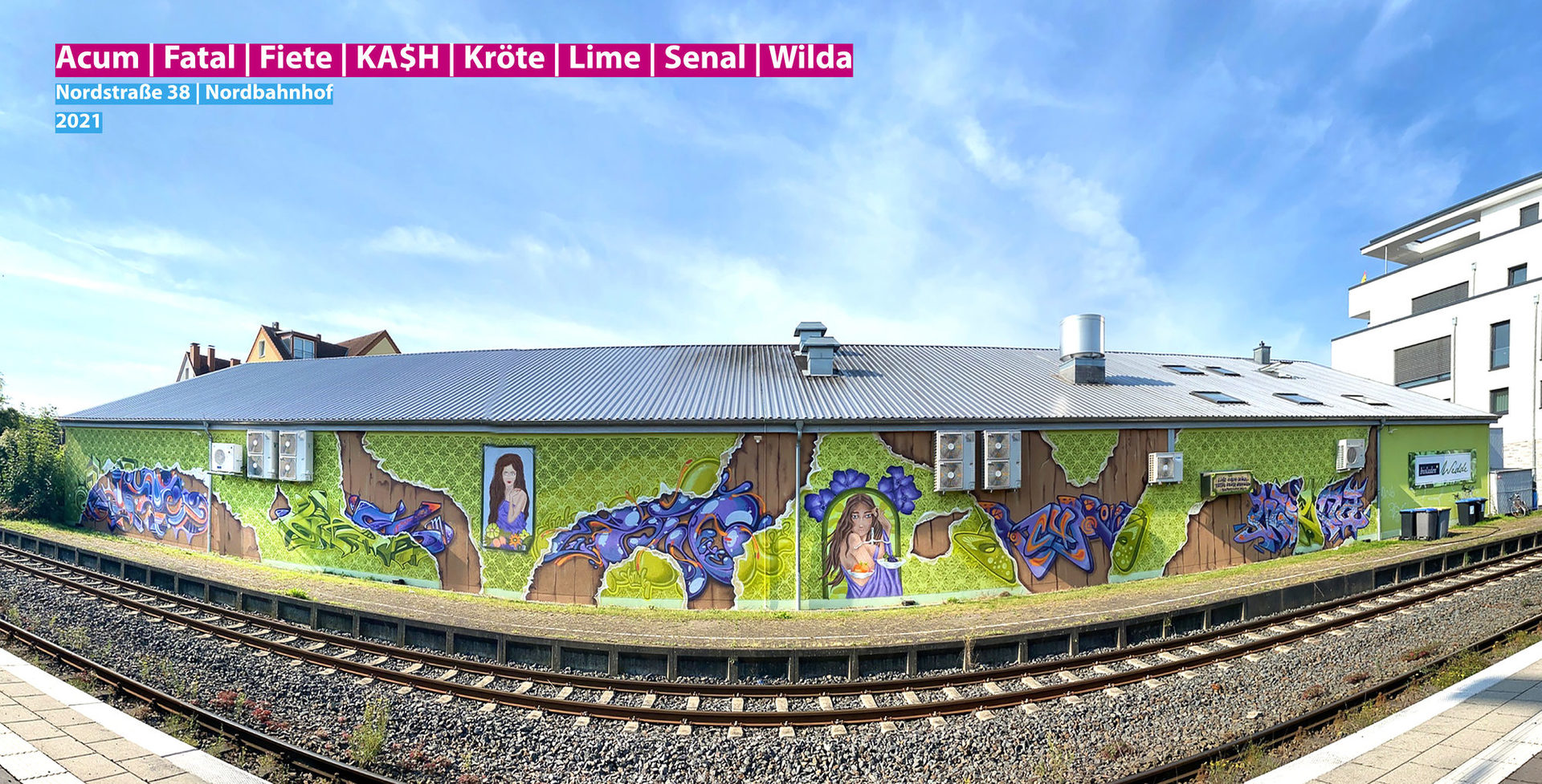 Das Grundkonzept für die Gestaltung besteht aus einer Vintage-Tapete, die sich an bestimmten Stellen ablöst und damit eine zweite Gestaltungsebene hervorbringt. Das Grundmuster der Tapete wurde zunächst auf die in grün grundierte Wand mit einer Schablone aufgesprüht. Anschließend malten die Graffiti-Künstler:innen jeweils einen Style oder einen figurativen Character auf die Wand. Die Schriftzüge gehen jeweils in die zweite Ebene parallel über und verbinden zwei unterschiedliche Graffiti-Styles miteinander. Wieder ein beeindruckendes Wand-Konzept, das aus der Feder von Lukas Michalski, aka KA$H stammt und vom Allstar-Team Acum, Fatal, Kash, Kröte, Lime, Senal und Wilda erstklassig umgesetzt wurde.