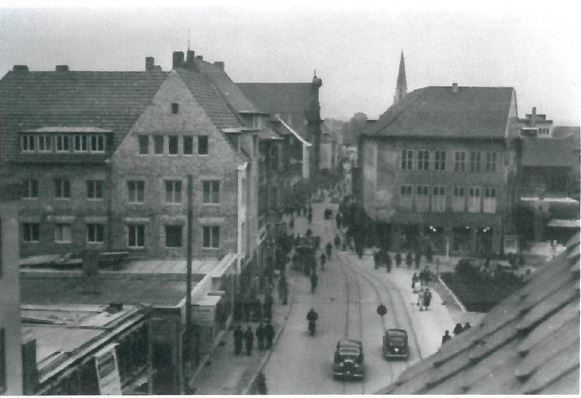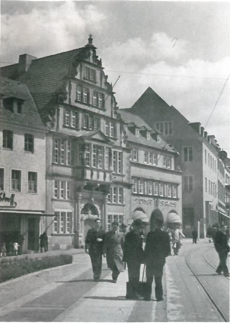 © Stadtarchiv PaderbornMarienplatz 11, links, mit der Giebelfront zum Betrachter, bis 1956 Ausweichquartier der Stadtverwaltung, Aufnahme um 1950.