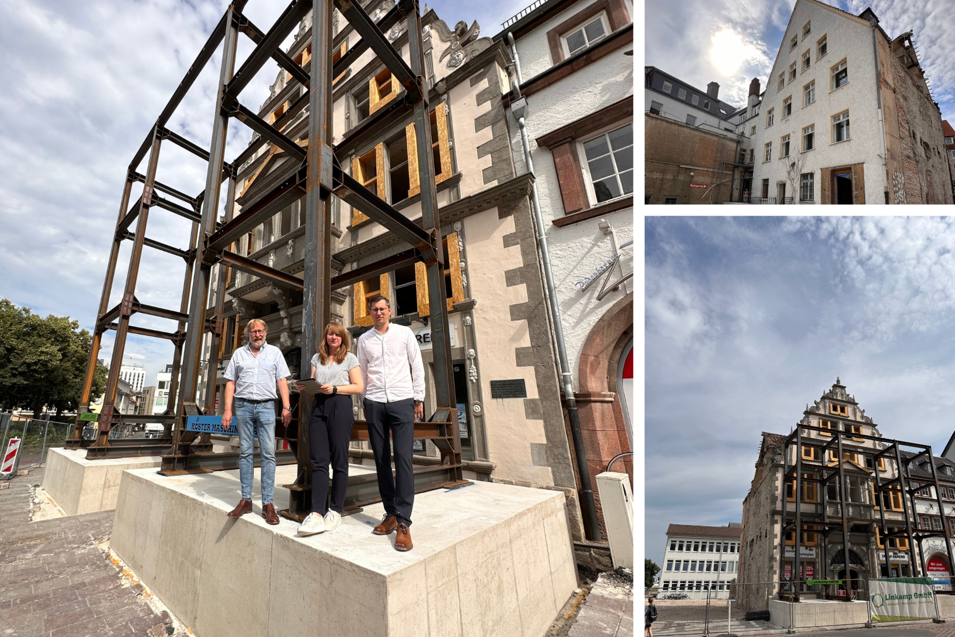 © Stadt PaderbornZur Sicherung der denkmalgeschützten Fassade wird ein Stahlgerüst um das Heisingsche Haus gebaut.