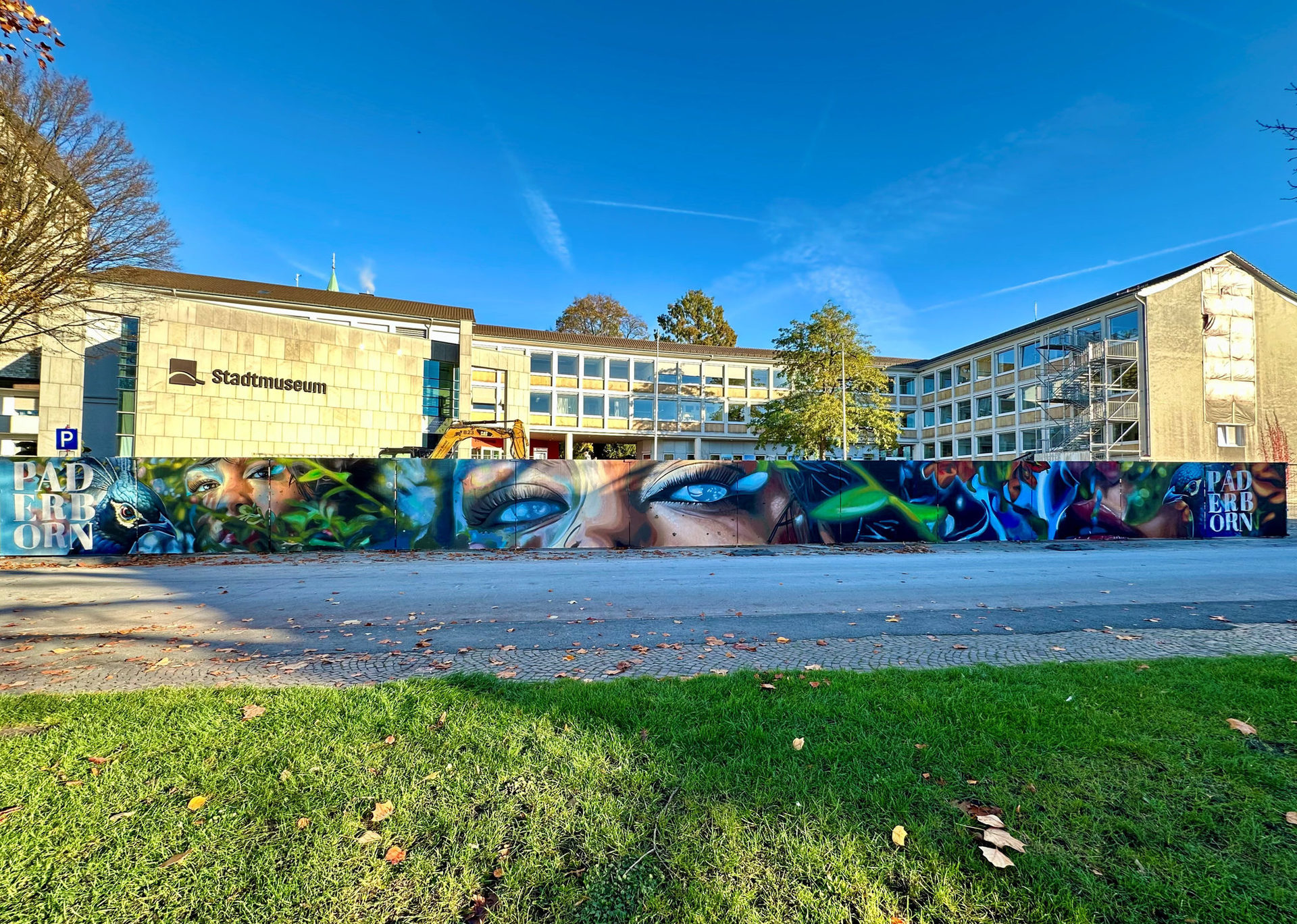 Ein neues Graffiti ist seit Kurzem entlang der Stadthaus-Baustelle am Abdinghof zu sehen: Der Künstler Philipp Uthmann gestaltet derzeit im Auftrag der Stadt Paderborn einen 30 Meter langen Bauzaun. Das farbenfrohe Motiv, das auch vom Paderquellgebiet aus bestaunt werden kann, lässt verschiedene Bezüge zur Stadt erkennen: Neben dem Pfau, der als Wahrzeichen eng mit Paderborn – insbesondere mit dem Hl. Liborius und dem Liborifest – verknüpft ist, erinnern die verschiedenen Blau- und Grüntöne an die natürlichen Farben der nahegelegenen Flusslandschaft Pader. Das Graffiti solle aber auch zum Nachdenken anregen, wie Philipp Uthmann erläutert, der auch den Entwurf für das Kunstwerk entwickelt hat. Die in der Mitte dargestellte, dem Paderquellgebiet zugewandte Frau habe keine Sehkraft, was die Betrachtenden dazu anregen soll, das eigene, oft als selbstverständlich wahrgenommene Beobachten und Bewerten zu hinterfragen.