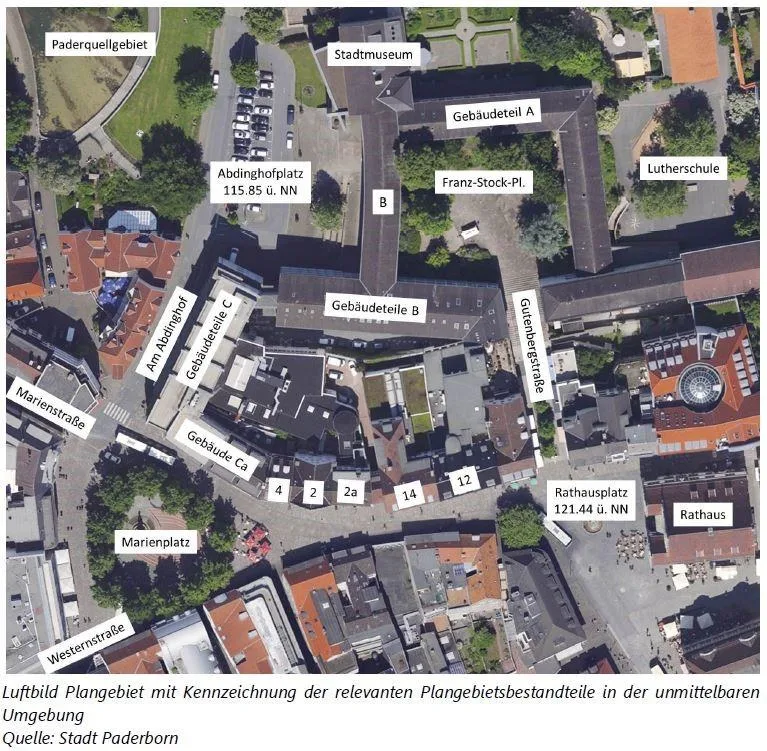 Im Juni 2023 beginnen die ersten Maßnahmen für den Abriss der alten Gebäudeteile der Stadtverwaltung. Nach dem Ausbau eines Öltanks am Verwaltungsgebäude C wird unter anderem die Parkplatzausstattung Am Abdinghof zurückgebaut, ein Gerüstturm am später zu sanierenden Verwaltungsgebäude B (als Fluchtweg) aufgebaut und die Baustelle eingerichtet. Damit steht der Parkplatz Am Abdinghof ab 12. Juni nicht mehr zur Verfügung. Die öffentliche WC-Anlage ist ab sofort nicht mehr zugänglich und kann somit nicht mehr genutzt werden.