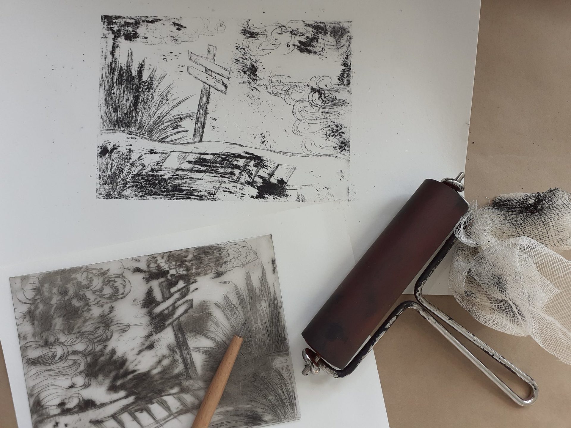 Nach einer Führung durch die Ausstellung können die Schüler*innen ihren eigenen Erinnerungsort illustrieren und wenden dabei ein vereinfachtes Tiefdruckverfahren an.