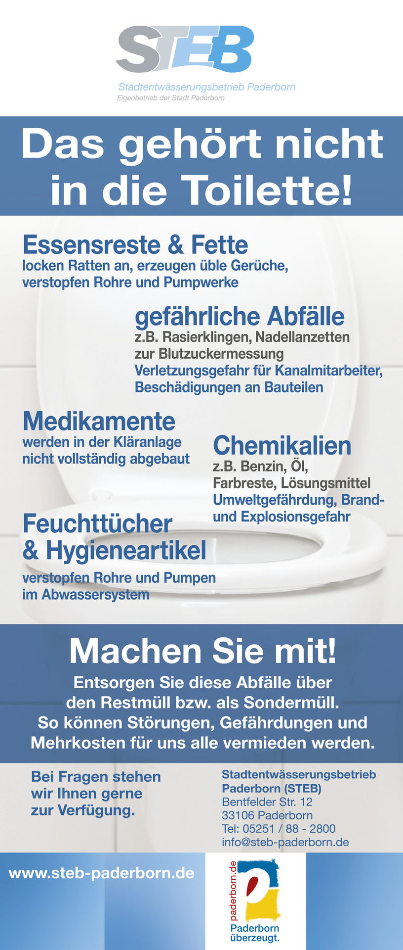 Das Abwasser muss vieles schlucken, bevor das kühle Nass aus der Kanalisation wieder als genussvolles und gesundes Trinkwasser aus dem Hahn fließt: Feuchttücher, Medikamente, Essensreste und Chemikalien – mal fest, mal flüssig – landen kurzerhand über die Toilettenspülung in der Kanalisation. Der schwer abbaubare Abfall muss dort mit aufwendigen Verfahren wieder aus dem Wasser gefischt und herausgefiltert werden. Der hohe Reinigungsaufwand in den Kläranlagen belastet das Portemonnaie von Verbraucherinnen und Verbrauchern sowie die Umwelt gleichermaßen. „Jeder kann dazu beitragen, das Abwasser so wenig wie möglich zu verschmutzen. "Abhilfe schafft schon ein kleiner Mülleimer im Bad, um etwa Feuchttücher, Hygieneartikel oder Medikamente für die Restmülltonne darin zu sammeln“, rät Marcus Heidebrecht vom Stadtentwässerungsbetrieb Paderborn, kurz STEB. Die Umweltberatung der Verbraucherzentrale Paderborn zeigt den Verbrauchern wie es geht, Toiletten und Abflüsse nicht als Mülleimer zu benutzen.
