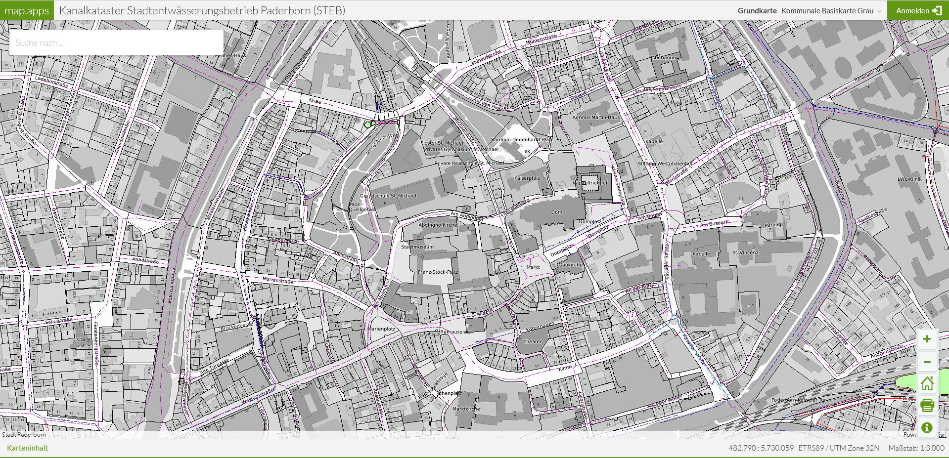 Im digitalen Kanalkataster des Stadtentwässerungsbetriebs (STEB) der Stadt Paderborn sind alle Misch-, Regen und Schmutzwasserkanäle digital verzeichnet und über eine Onlineabfrage können die benötigten Informationen nun auch selbstständig abgerufen werden.