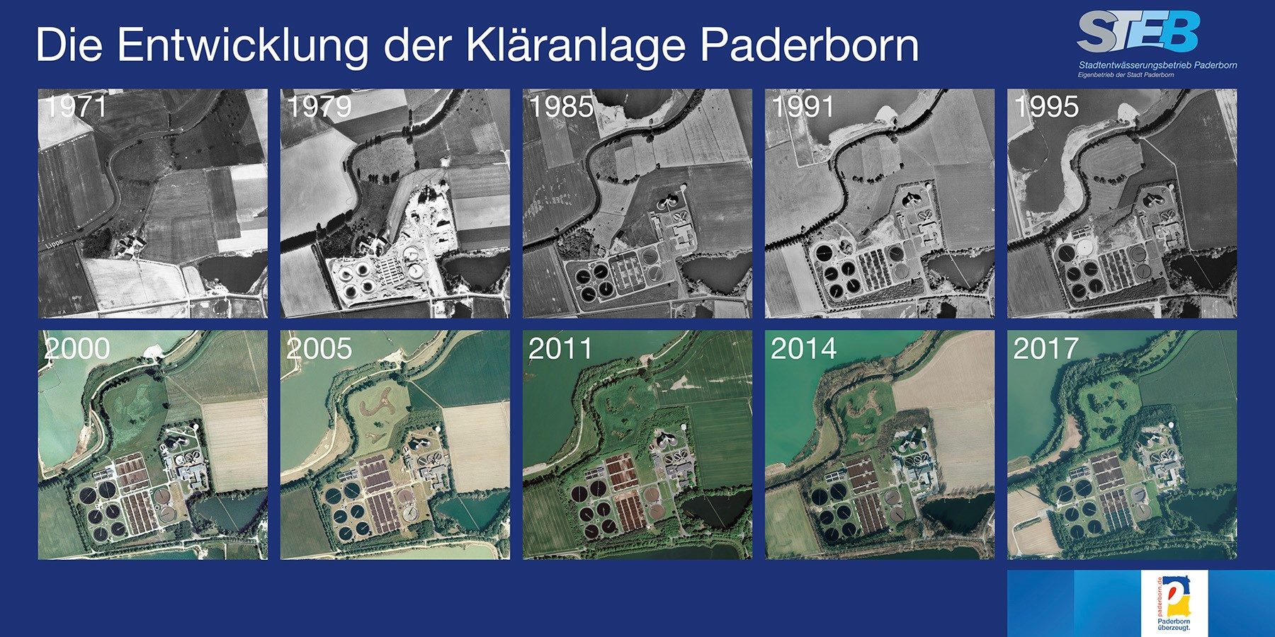 Die nachfolgende Luftbildcollage zeigt die Entwicklung der Kläranlage Paderborn im Laufe der Zeit.
