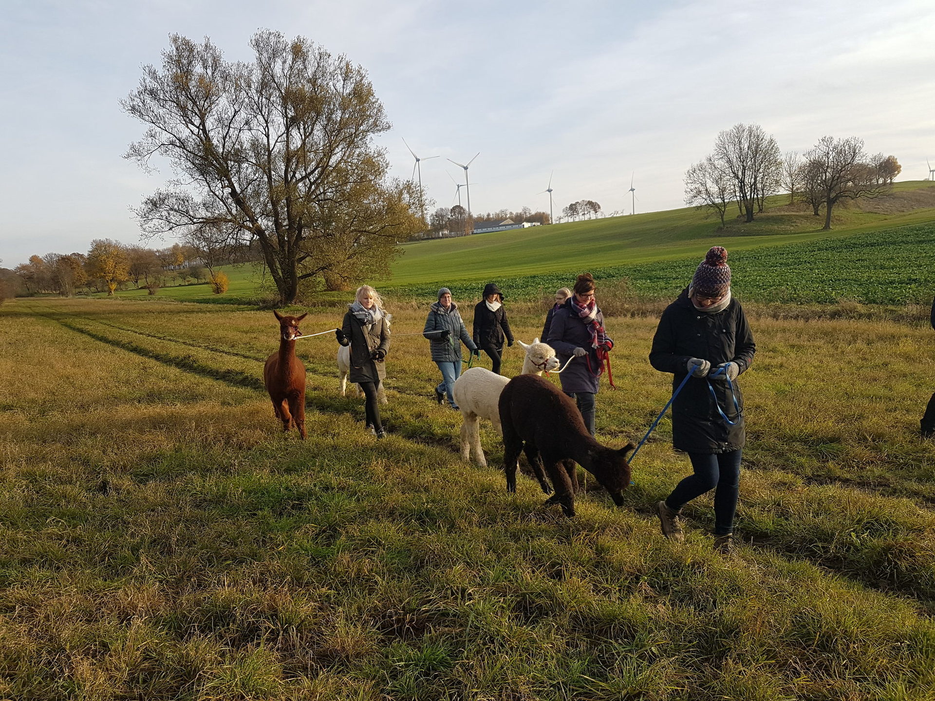 Mit ihren großen, dunklen Augen, den langen Wimpern und ihrem sanftmütigen Wesen ziehen die Alpakas Groß und Klein in ihren Bann und zaubern ein Lächeln in die Gesichter der Teilnehmer. So eine Wanderung (Dauer 2 – 2,5 Stunden) ist Wellness für Körper und Seele. Während der geführten Wanderung wird viel Wissenswertes über die Tiere, ihr Wesen und die Haltung erzählt. Auch eine kleine Rast mit einem Snack und Getränk wird eingelegt. Zurück auf dem Hof besteht die Möglichkeit, Erinnerungsfotos an die Wanderung zu schießen.
