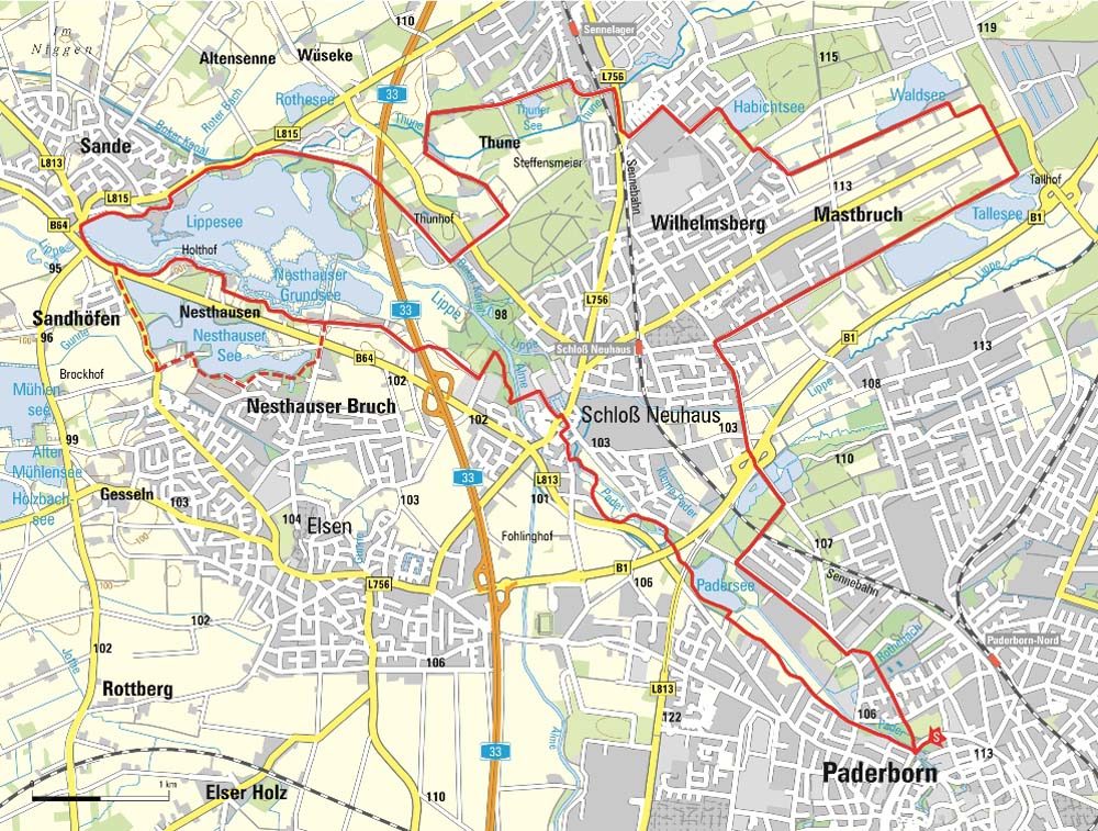 Die bequem zu radelnde Paderborner Seentour führt in das nördliche Stadtgebiet Paderborns in eine Landschaft, die durch zahlreiche Seen geprägt wird. Sie verläuft weitestgehend auf autofreien Wegen, ist ohne Steigungen und daher auch für Familien mit Kindern bestens geeignet. Mehrere Kinderspielplätze liegen direkt am Weg, der Neuhäuser Schlosspark lockt mit Freilichtbühne und Minigolf, der Lippesee mit Badestrand, Tretbootverleih und Fahrradgeländeparcours.