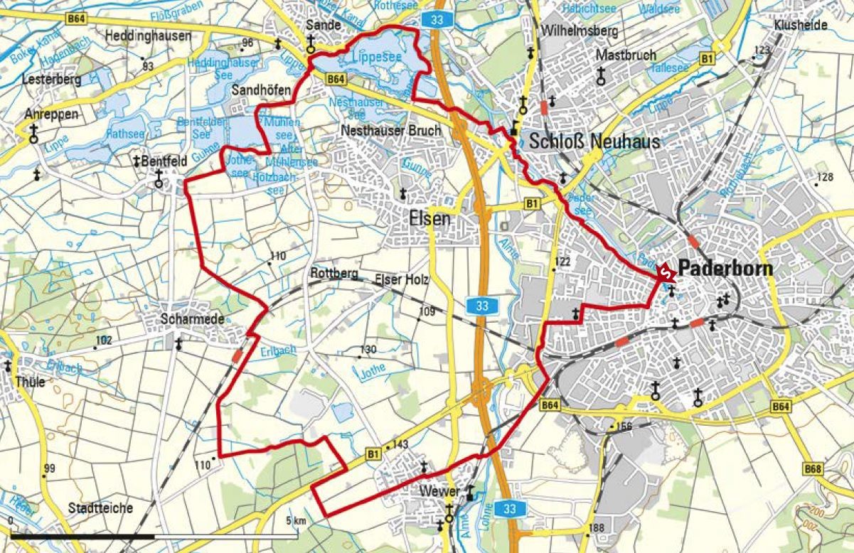 Maspernplatz – Wewer (6,5 km) - Scharmede Bf. (15 km) - Sande / Lippesee (23,3 km) - Schloß Neuhaus (29 km) - Maspernplatz (33,4 km).