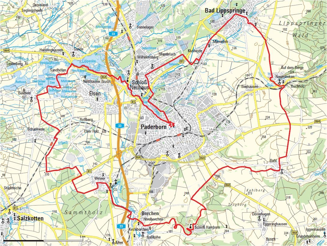Maspernplatz – Bad Lippspringe (12,8 km) - Neuenbeken (18,6 km) - Dahl (24,5 km) - Schloss Hamborn (34,5 km) - Borchen (40,1 km) - Wewer (43,4 km) - Scharmede Bf. (52,8 km) - Lippesee (60,5 km) - Schloß Neuhaus (64,7 km) - Maspernplatz (69,3 km).