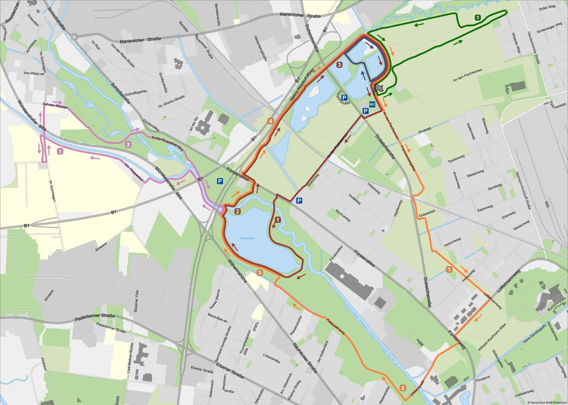 Das beliebte Laufgebiet rund um Fischteiche, Padersee und Paderauen ermöglicht die Kombination unterschiedlicher Streckenlängen und -profile.
