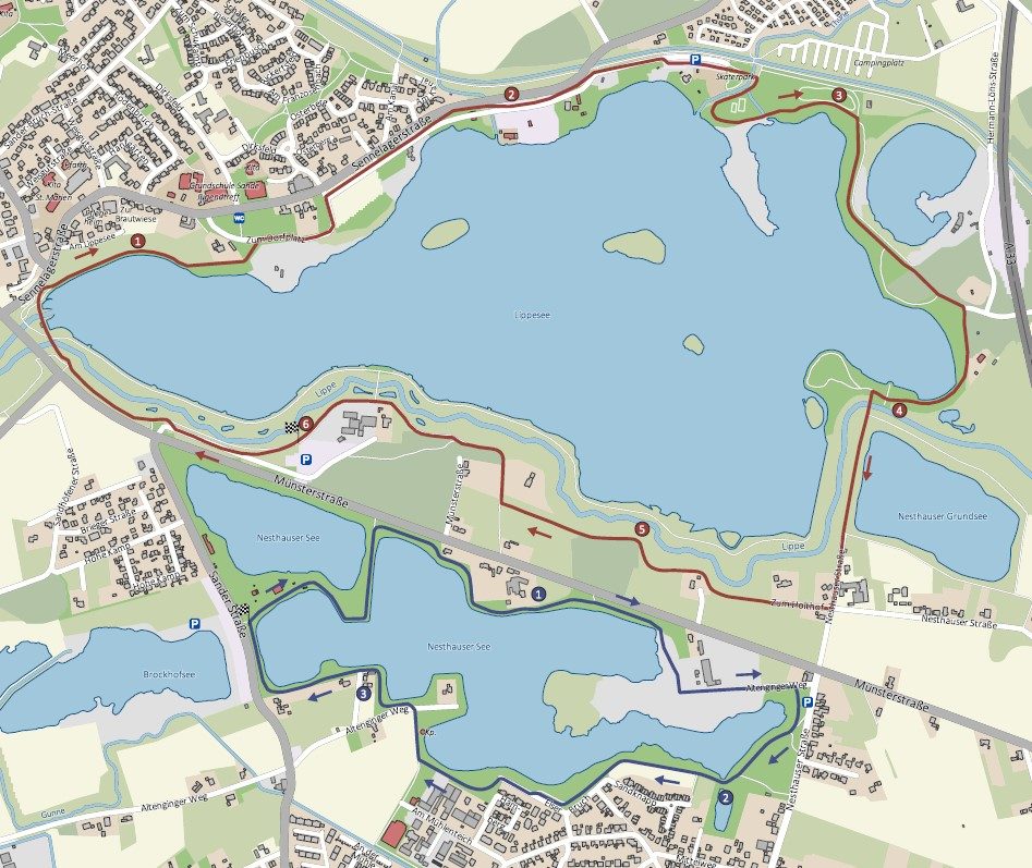 - 6.000 m - Laufstrecke um den Lippesee (rot)