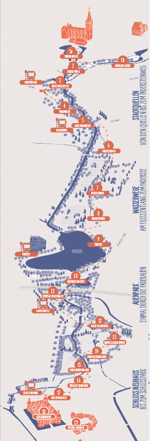 Startpunkt ist der Kardinal-Degenhardt-Platz bzw. das Paderquellgebiet. Weiter geht es über den Platz hinter der Reinekemühle zum mittleren Paderquellgebiet und durch die Unterführung in die Paderwiesen. Am Ende der Paderwiesen würden wir normalerweise in den Padersteinweg einbiegen. Dieser ist jedoch wegen Bauarbeiten gesperrt. Deshalb fahren Sie mit dem Bus von der Haltestelle Rolandsweg zum Padersee. Dort angekommen ist das Hebewerk am Padersee die nächste Station. Von hier aus geht es weiter entlang der Pader bis zum Spielplatz Fürstenallee und dann den gesamten Emilie-Rosenthal-Weg entlang bis zum Grünen Klassenzimmer und darüber hinaus. Am Ende des Emilie-Rosenthal-Weges biegen wir zum Bolzplatz Schloß Neuhaus ab. Durch das Wohngebiet geht es in Richtung Kirche und dann in den Schlosspark. Im Innenhof des Schlosses sowie im Marstall-Innenhof finden weitere Programmpunkte statt.