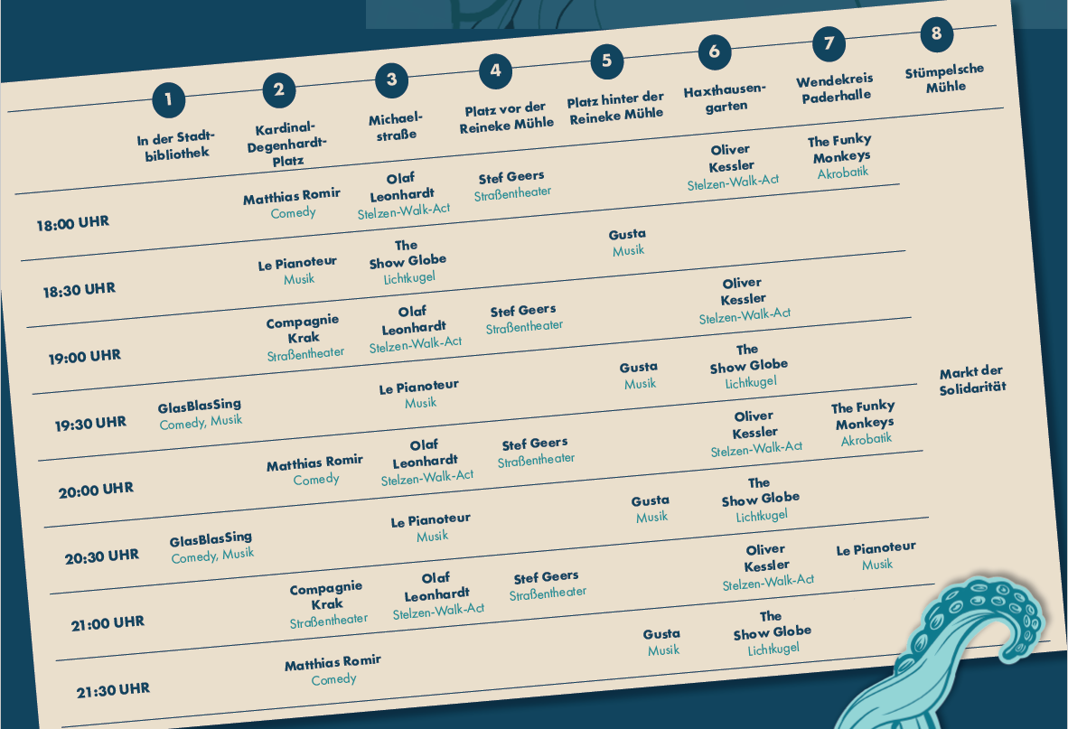 Am 29.08.2025 sind von 18:00 bis 22:00 Uhr an acht Orten zwischen Stadtbibliothek und Stümpelscher Mühle Musik, Straßenkunst und Artistik zu finden. Immer zur halben und vollen Stunde beginnen insgesamt elf Künstler:innen ihre Show.