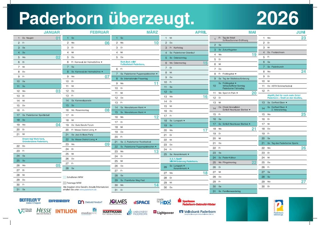 Hier präsentieren wir Ihnen die Paderborner Veranstaltungshighlights im Jahr 2026. Freuen Sie sich u.a. wieder auf Traditionsveranstaltungen sowie Messen, Events, Sport-, Kirmes- und weitere Marktveranstaltungen im Jahresverlauf.