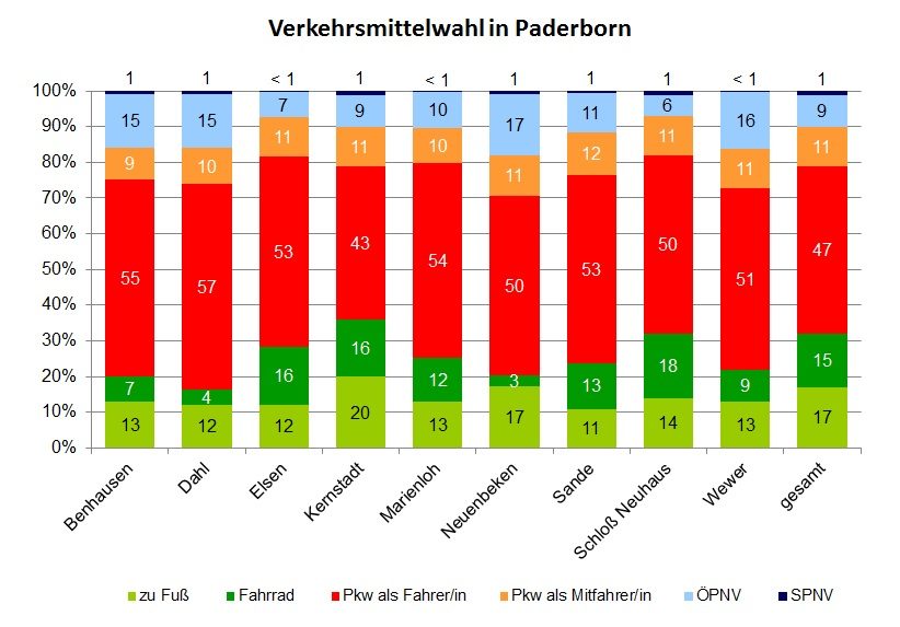 Das Mobilitätsverhalten wurde auf Ebene der Stadtteile von Paderborn untersucht. Es zeigt sich, dass die Kernstadt den größten Anteil an Fußgängern besitzt, während die Einwohner in Schloß Neuhaus am häufigsten mit dem Fahrrad unterwegs sind. Den größten Anteil von ÖPNV-Nutzern findet man im Stadtteil Neuenbeken. Dahl ist der Stadtteil mit dem höchsten Anteil an Pkw-Nutzern.