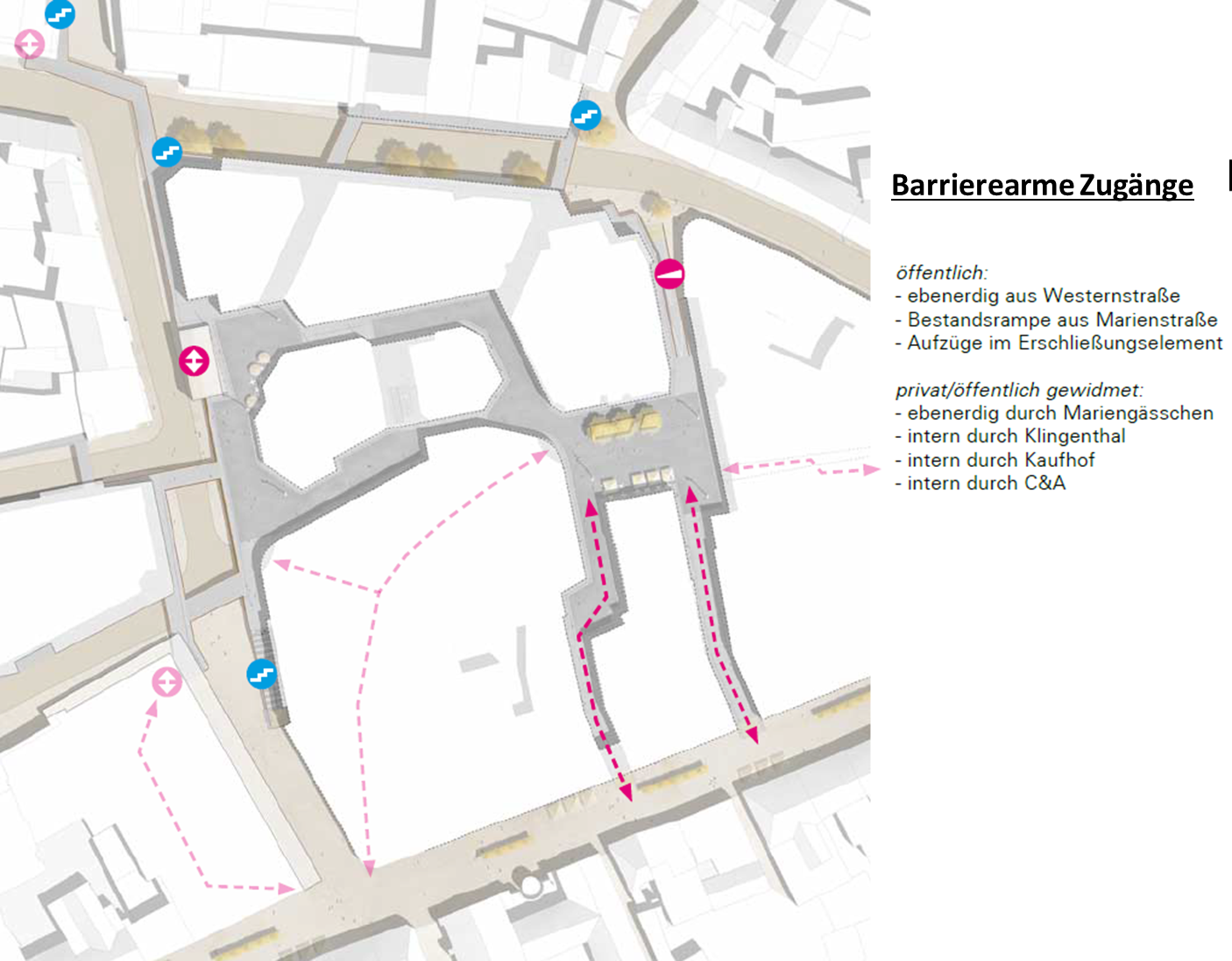 Außerdem sind die Königsplätze über das zentrale Erschließungselement in der Königsstraße auf allen Ebenen barrierefrei zu erreichen.