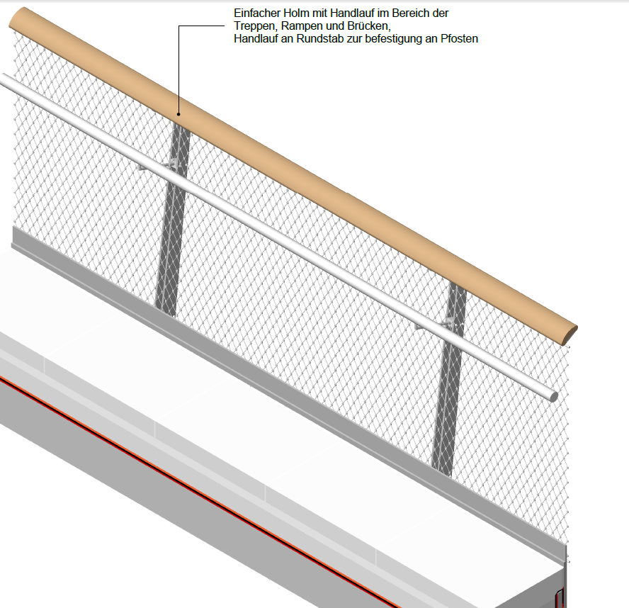 Die Geländer der Brücken werden entsprechend der Brüstung auf dem Königsbalkon gestaltet. Anstatt des breiten Anlehnholms der Brüstung auf dem Königsbalkon, befindet sich an den Brücken ein einfacher Holm mit Handlauf.