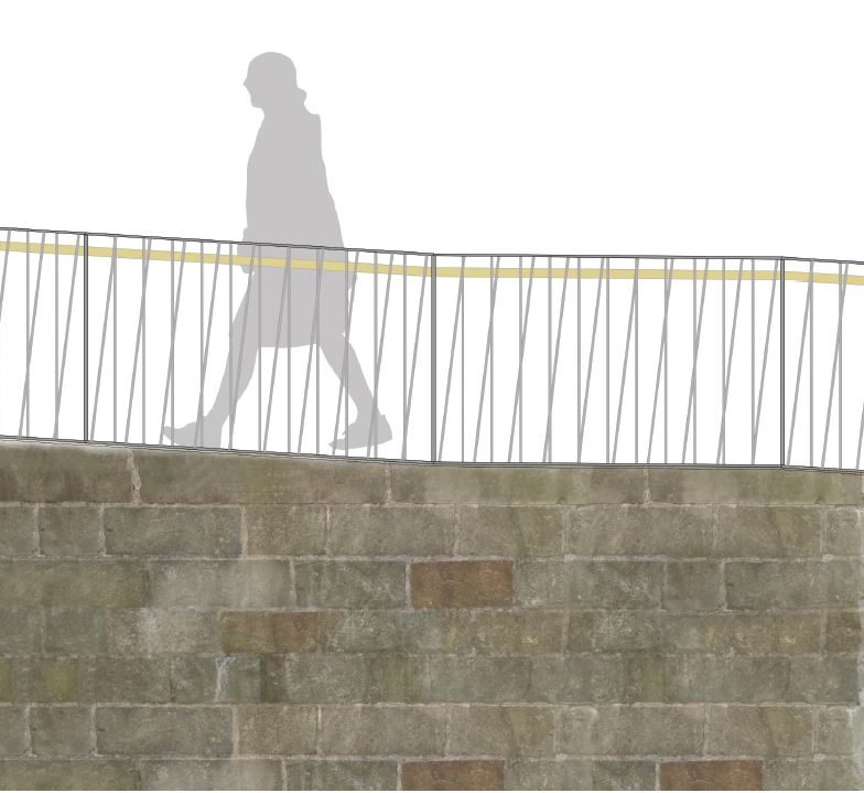 Das Geländer der Rampe besteht aus einer rahmenden Flachstahlkonstruktion mit einer filigranen Füllung aus sich verschränkenden Rundstäben, die denen der Baumschutzgitter entsprechen. Der Handlauf des Geländers ist auf einer Seite der Rampe beleuchtet.