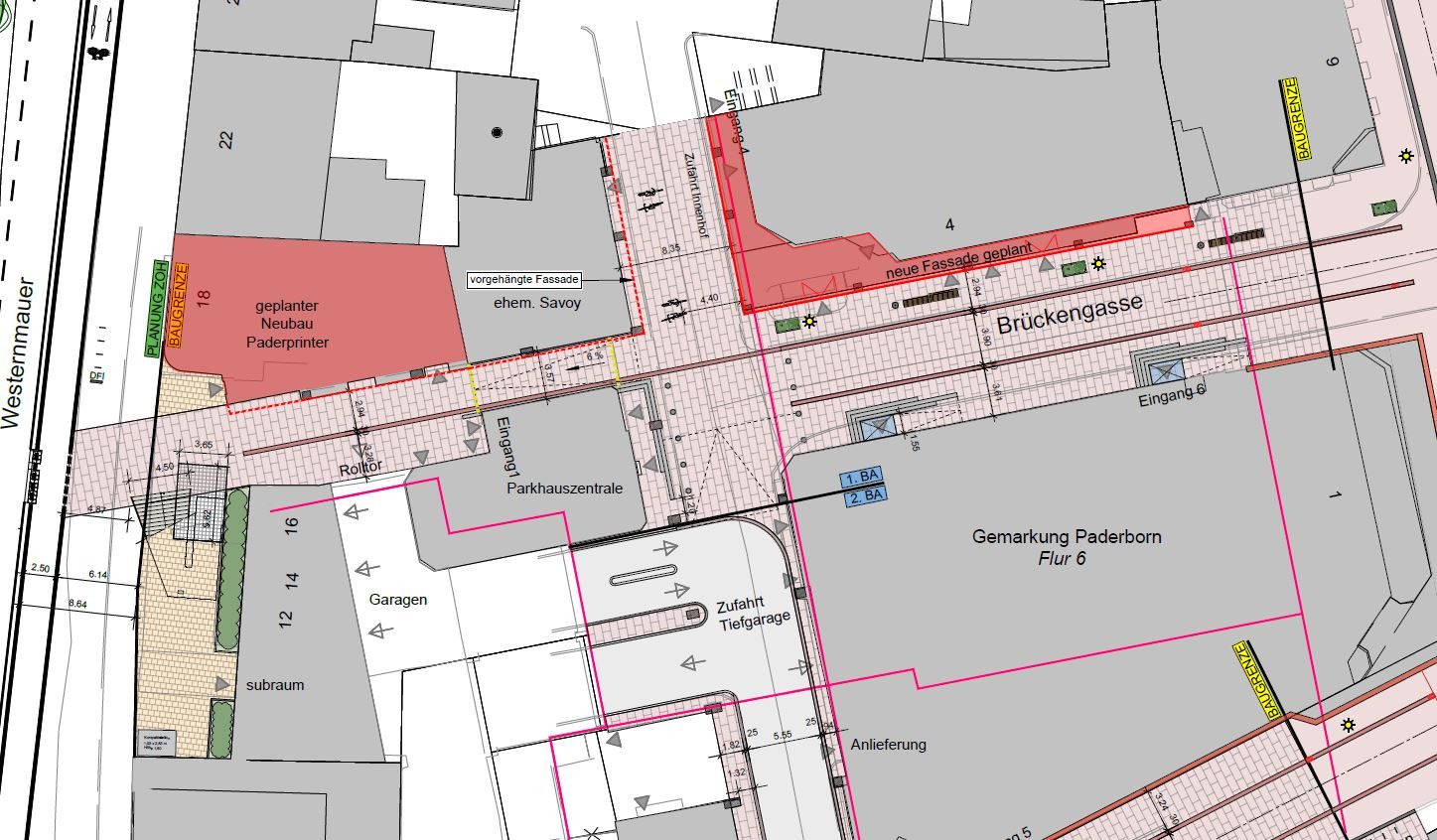 Der Durchgang durch das Gebäude Westernmauer 12-16 als Verbindung zwischen Brückengasse und Westernmauer wird sich baulich wie gestalterisch deutlich verändern. In Verbindung mit dem Standortneubau des PaderSprinter ist eine künstlerisch gestaltete Glaskunstwand geplant, in der insb. auch Licht- und Beleuchtungseffekte integriert werden. Dadurch soll der Durchgang eine optische Aufwertung und einladende Qualität erhalten, die das derzeitige unübersichtliche und schlecht beleuchtete Ambiente ablöst.