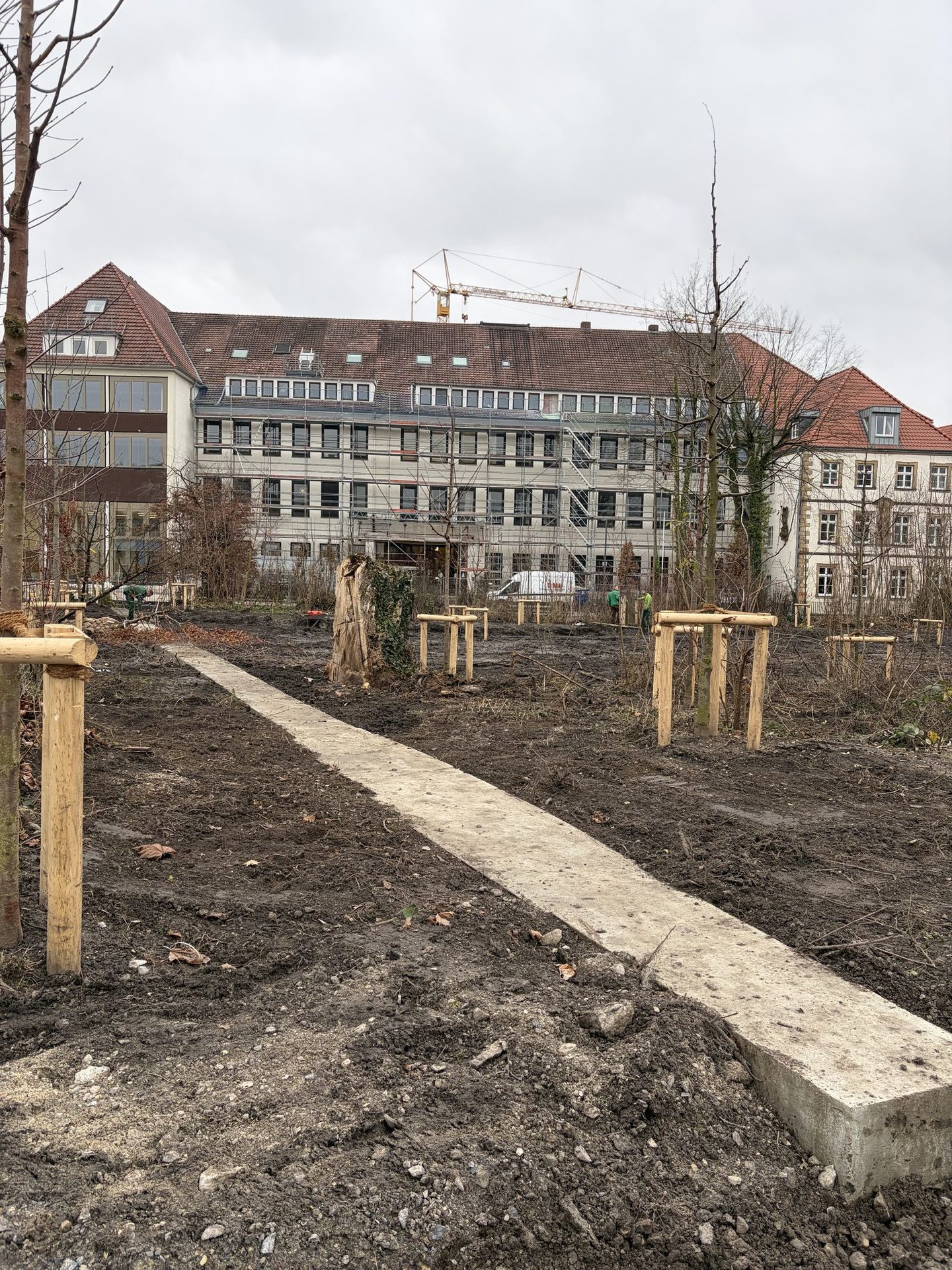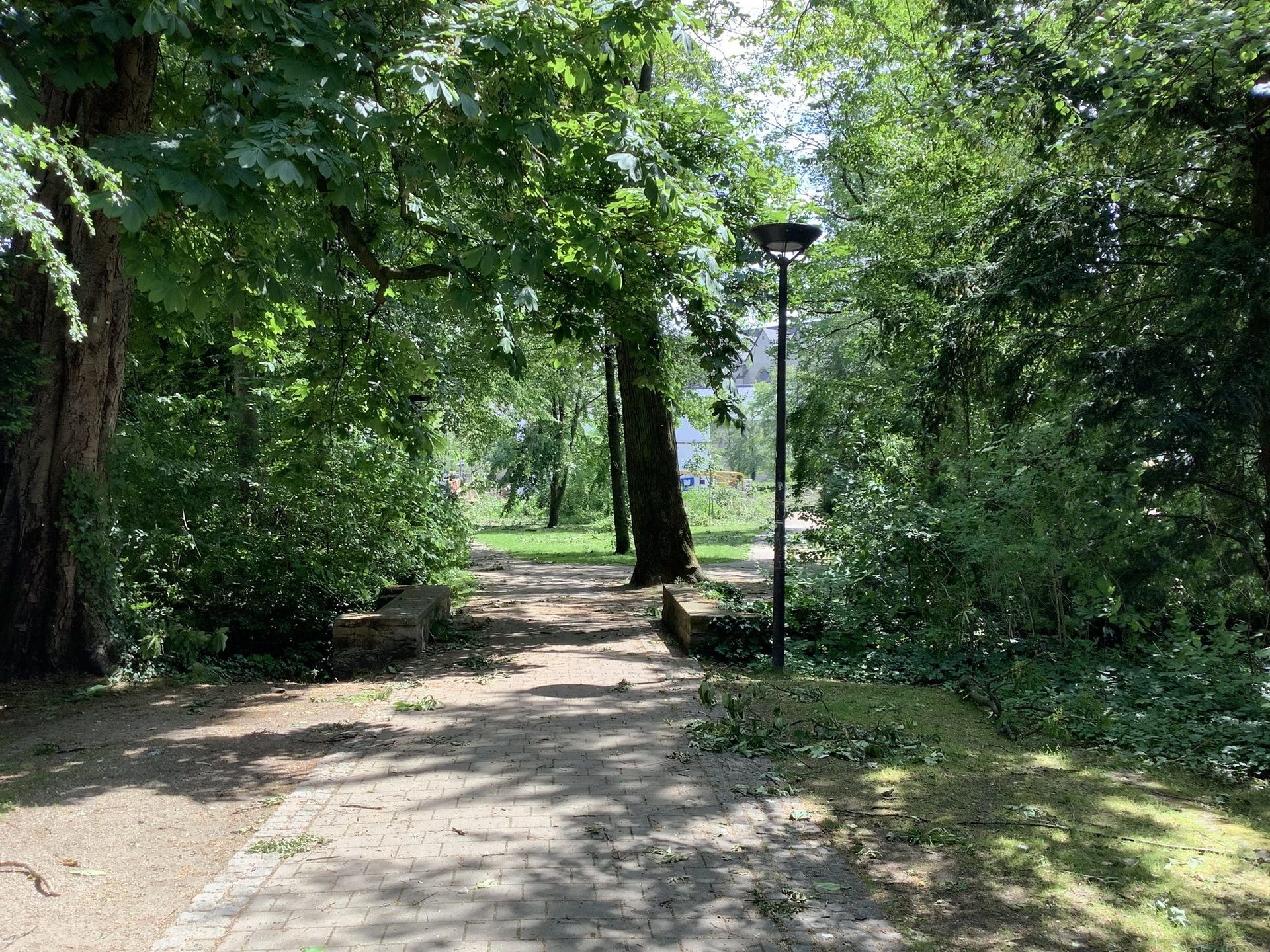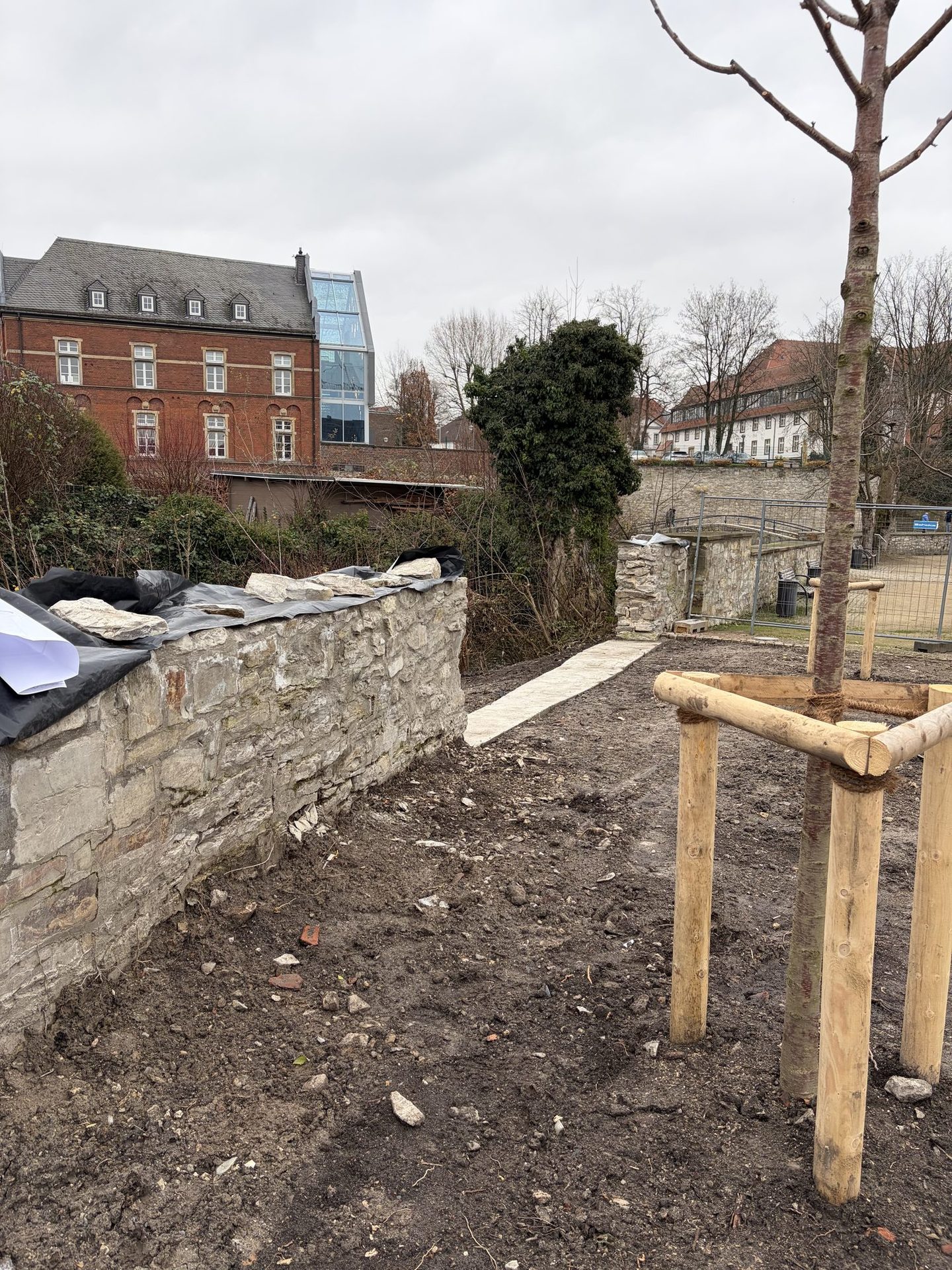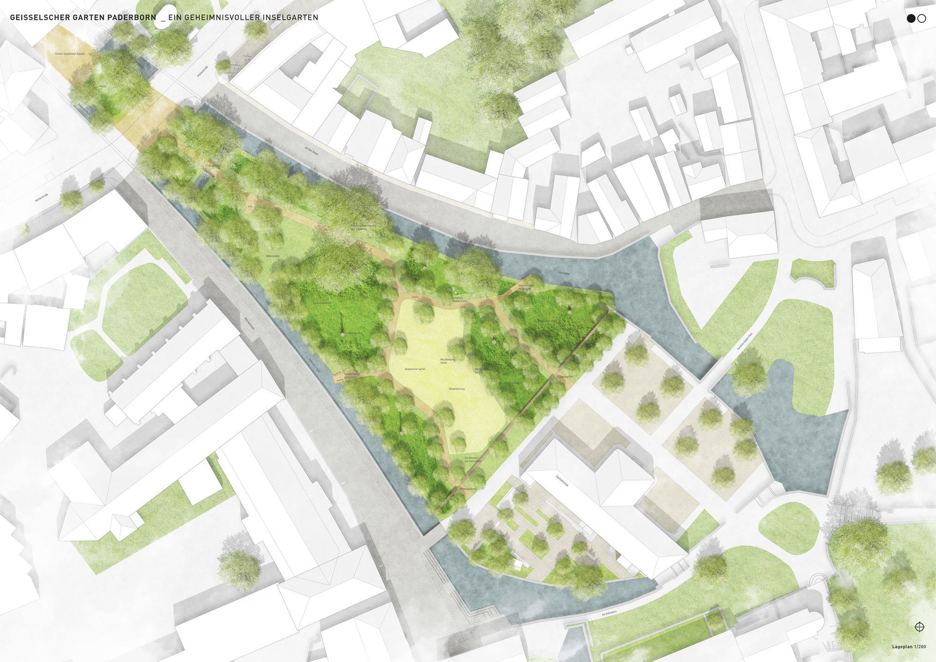 Das Konzept des Büros Lohaus Carl Köhlmos überzeugte insbesondere durch einen offensiven Umgang mit der Geschichte des Geisselschen Gartens. Der Gestaltungsentwurf orientiert sich an dem, was die Grünfläche ursprünglich war – ein Garten, kein Wald oder Park. „Ausgangspunkt ist die historische Stadt“, erklärte Planerin Irene Lohaus. Elemente aus unterschiedlichen Zeitschichten würden dabei aufgegriffen: So werde die in Relikten noch erhaltene Mauer, mit dem der Garten früher eingerahmt wurde, in Form einer ca. 1,3 Meter hohen Lehmmauer auf der Seite zur Stadtbibliothek aufgriffen. Darüber hinaus werde der Garten durch Gartenpforten und -tore betreten, die sich bei Bedarf auch schließen lassen würden. Der Weg würde im nördlichen Bereich des Gartens seinem heutigen Verlauf folgen und sich im Bereich der durch den Tornado zerstörten Fläche verzweigen. Dazwischen entstehe eine Lichtung, die ebenfalls schon einmal Teil des Geisselschen Gartens war. Zudem sind zwei Gartenplätze geplant, die leicht über die Pader ragen und einen ganz neuen Blick auf das Michaelskloster sowie auf die Fachwerkhäuser in der Straße Auf den Dielen bieten.