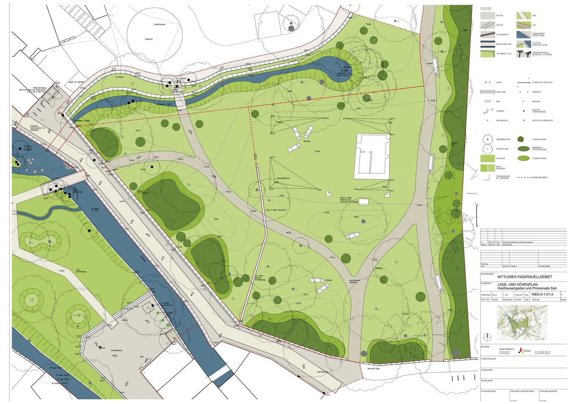 Wegnahme vorhandener Beetflächen verbreitert und für Rad- und Fußgängerverkehr gut zugänglich gestaltet. Als Übergang zum Haxthausengarten ist eine breite Sitzstufe geplant, sie bietet die Möglichkeit, auf die Pader und die Inselspitzen zu schauen.